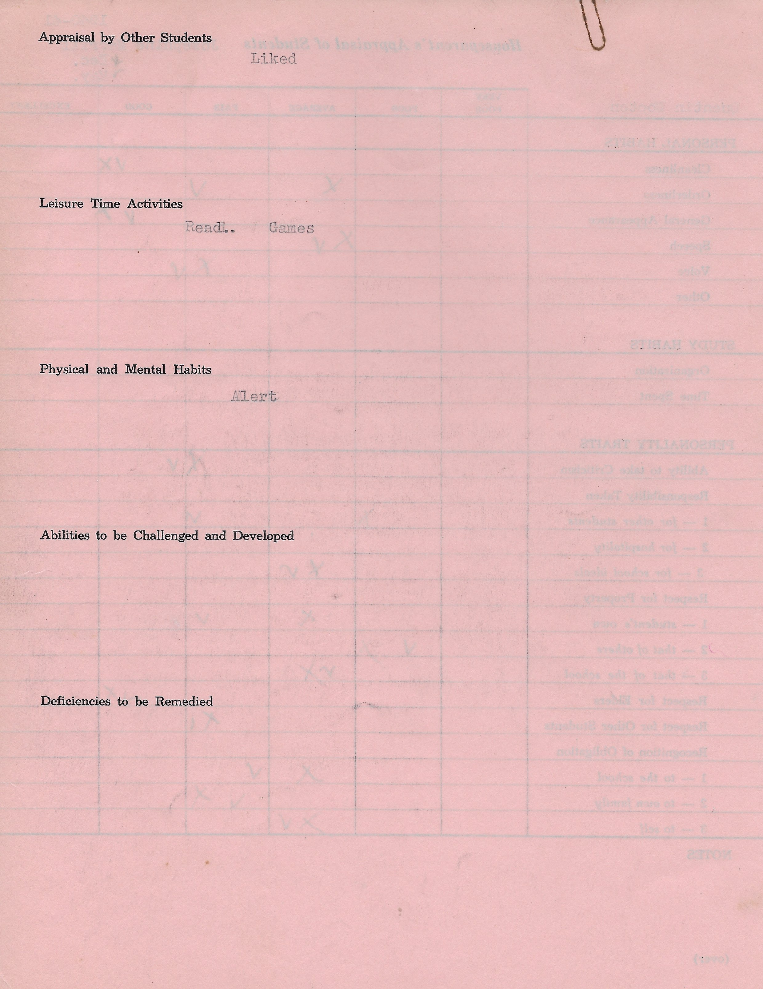 SCAN0307 and SCAN0308. December & May 1940-1941 – Houseparent’s Appraisal of Students with handwritten checkmarks for Personal Habits and Personality Traits.