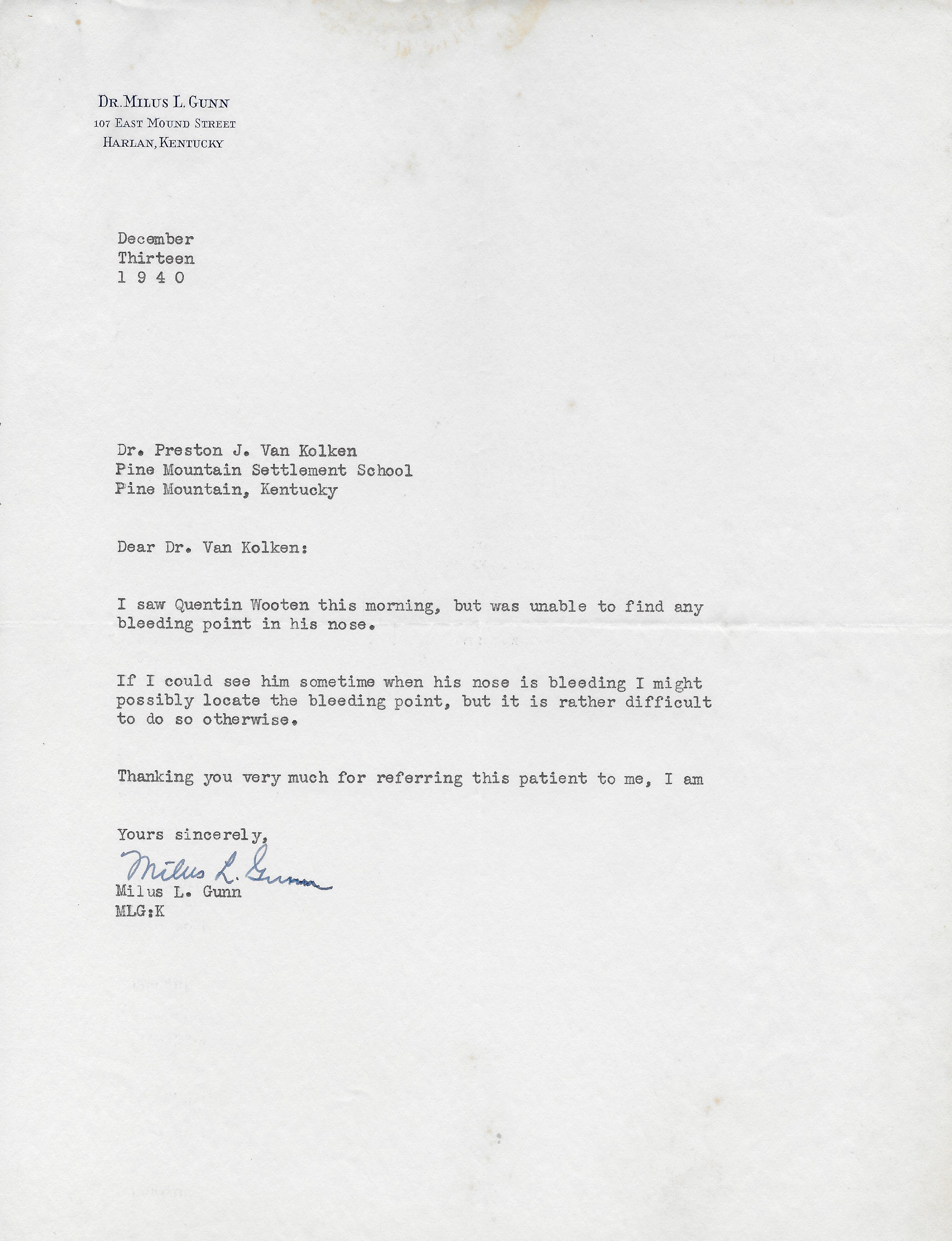 SCAN0309. December 13, 1940 – Typewritten letter from Dr. Milus L. Gunn, Hazard, KY, to Dr. Preston J. Van Kolken, PMSS, reporting his findings concerning Quinten Wooton’s nosebleeding.
