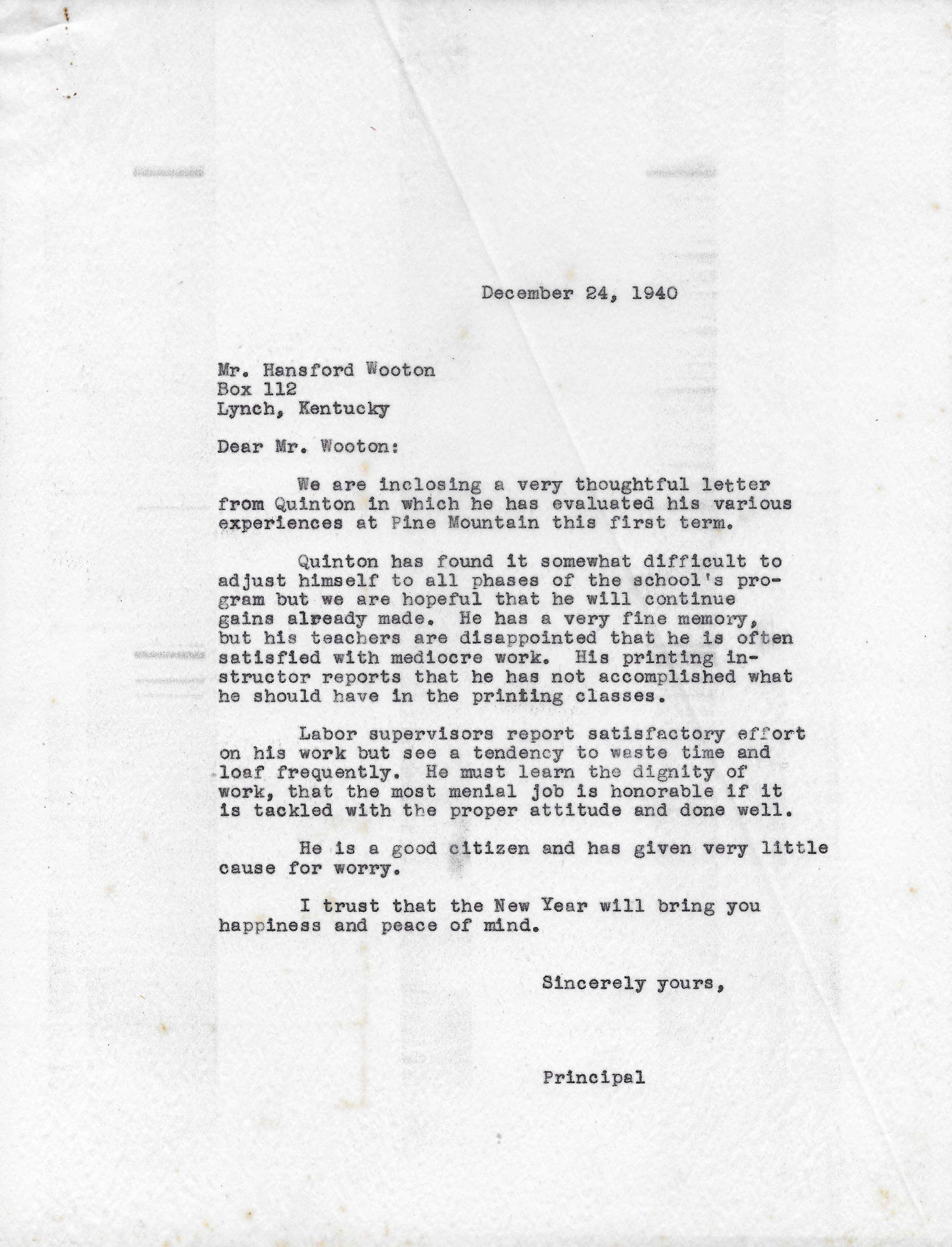 For the past year [Quinten Wooton] has been in attendance at Pine Mountain Settlement School and has made a worthy record for himself. We have found him to be honest and capable. At times he does not show great initiative but on the whole he will live up to what is expected of him. He has had some experience in our school store both with sales and with the bookkeeping and which should be of help to him.
