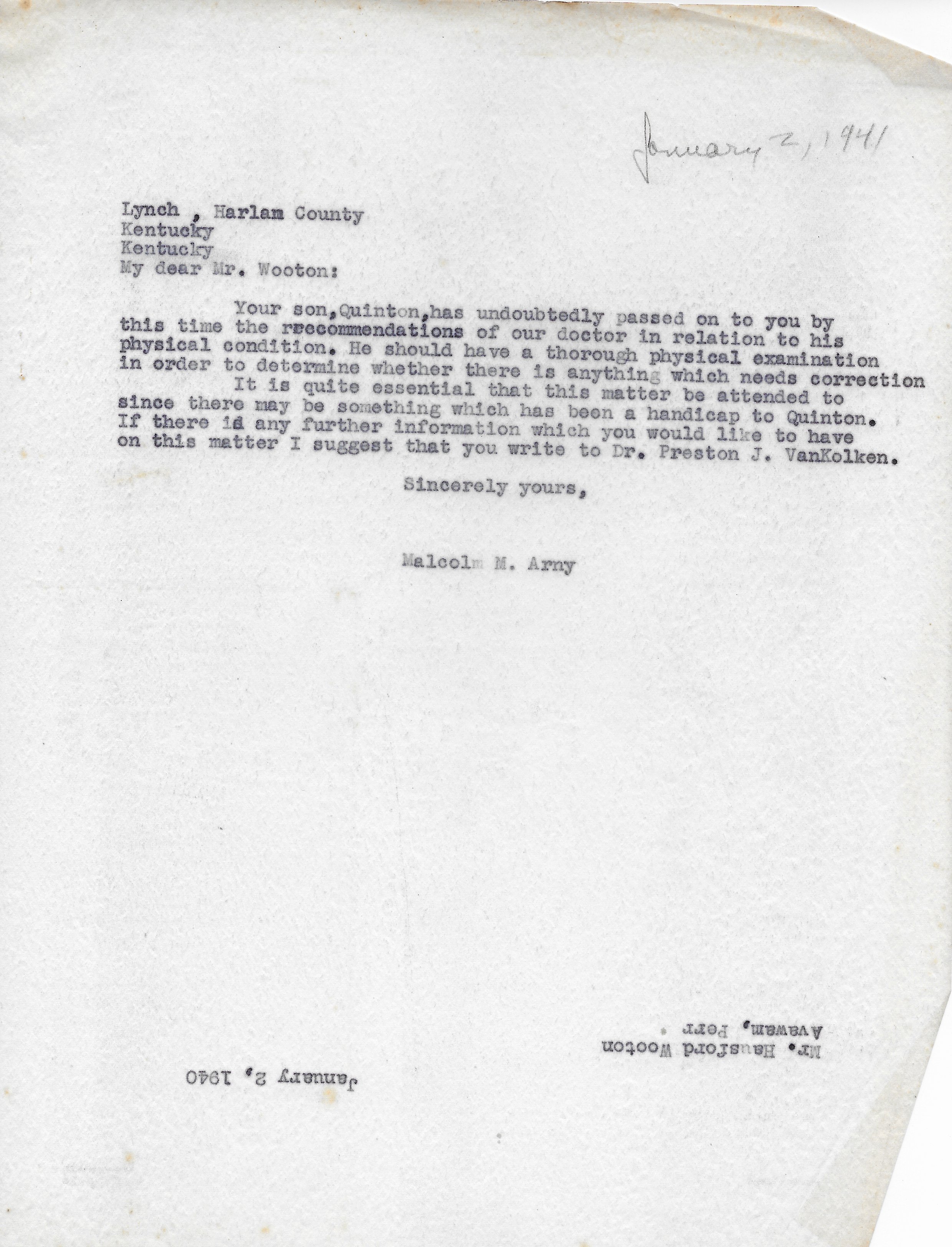 SCAN0311. January 2, 1941 – Carbon copy of typewritten letter to Mr. Wooton, Lynch, Harlan County, KY from Malcolm M. Arny, informing Mr. Wooton that his son should have a thorough physical examination, “…since there may be something which has been a handicap to Quinten.” Refers any question to Dr. Preson J. VanKoken.