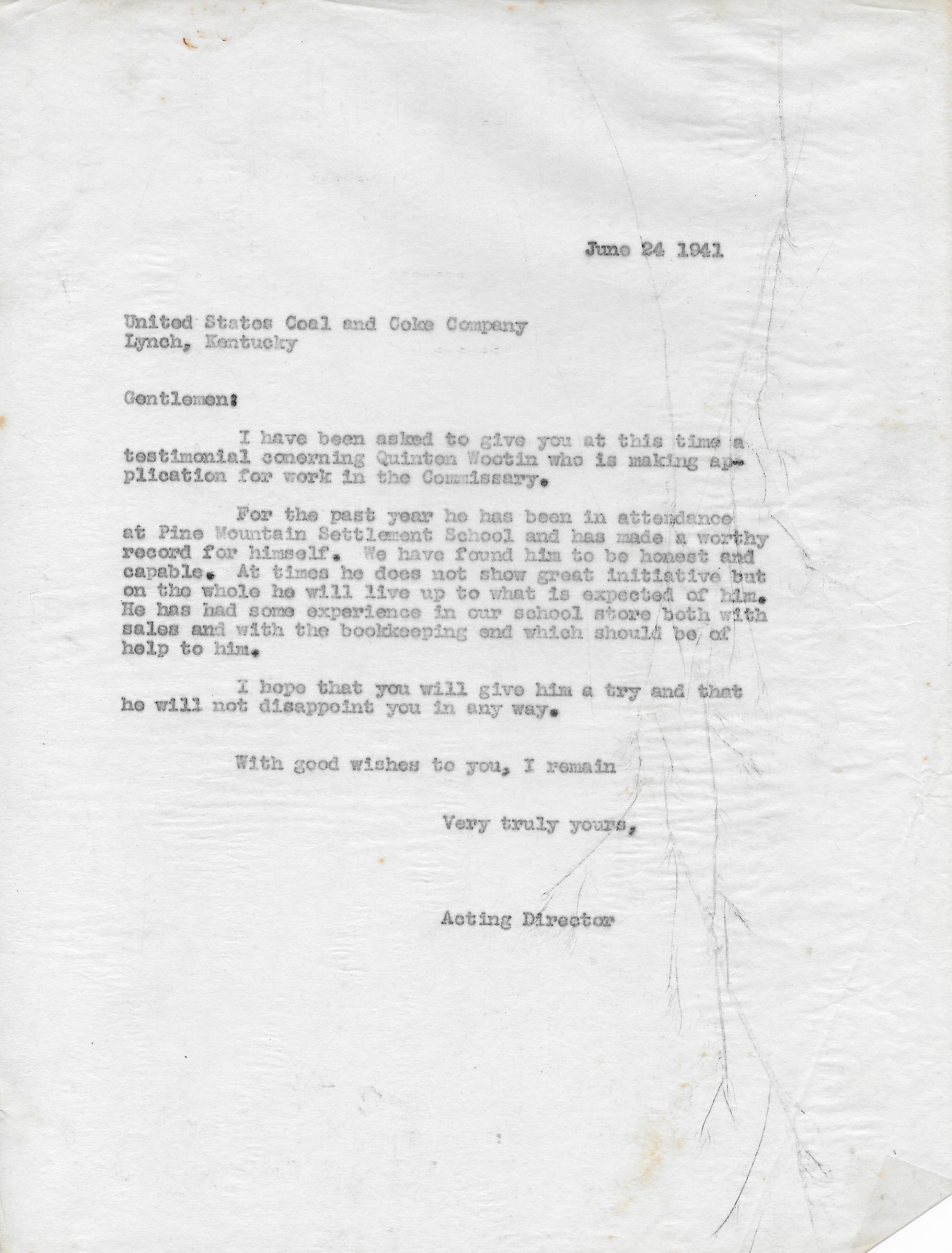 SCAN0312. June 24, 1941 – Carbon copy of typewritten letter to “Gentlemen” at United States Coal and Coke Company, Lynch, KY, from Acting Director [unsigned]. Provides reference for “Quinten Wooton who is making application for work in the Commissary.” ‘For the past year he has been in attendance at Pine Mountain Settlement School and has made a worthy record for himself. We have found him to be honest and capable. At times he does not show great initiative but on the whole he will live up to what is expected of him. He has had some experience in our school store both with sales and with the bookkeeping and which should be of help to him….”