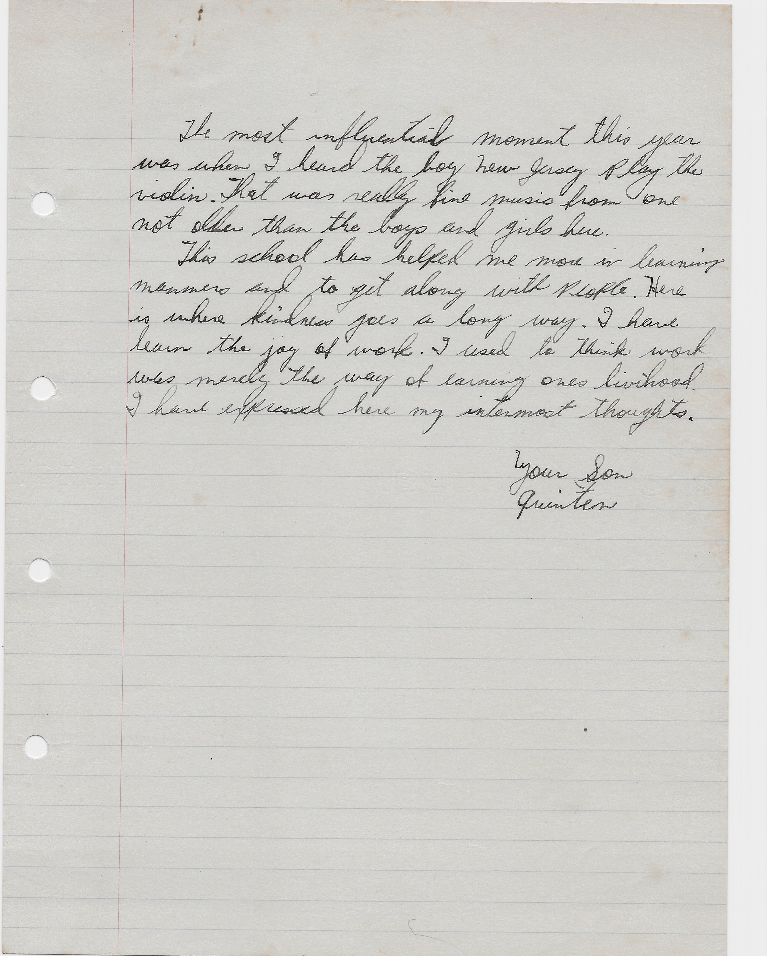 Quinten was showing improvement in his second year, most likely due to the School’s influence and his growing maturity. The School required all students to write a self-evaluation letter to their parents at the end of each school year. In Quinten’s second-year letter to his father, he recognizes his own improvements, which he attributes to the teachings of the School. In his letter, Quinten also expresses his dream of possibly entering the Navy Air Corps, echoing his father’s wish that he would be an airplane pilot. [For image and transcription of Quinten’s letter, see SCAN0314 and SCAN0315 below.]