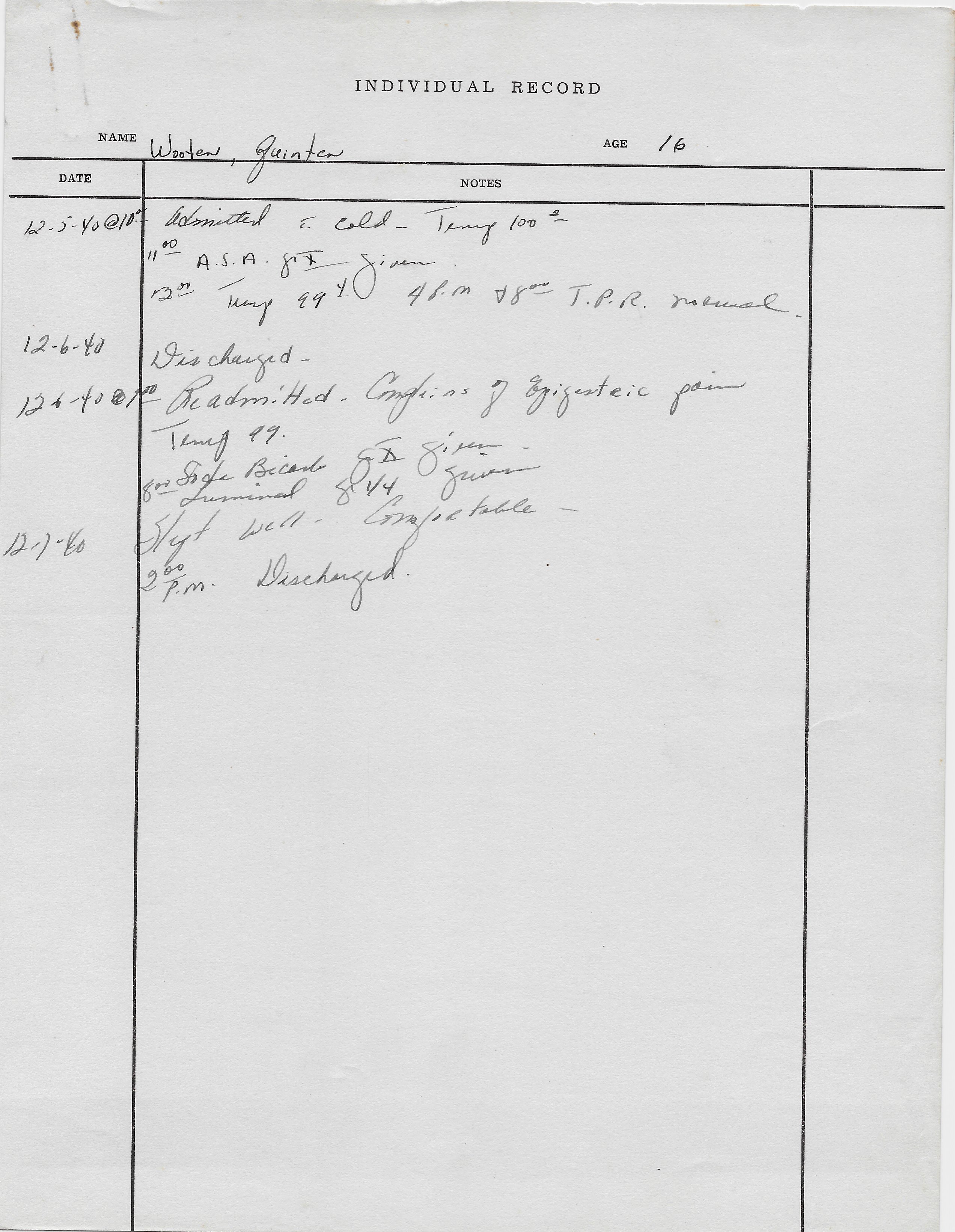 SCAN0316. December 5 – 7, 1940 – Individual [Infirmary] Report for Wooton, Quinten, age 16. Admitted with cold, then readmitted with complaints of digestive[?] pain.