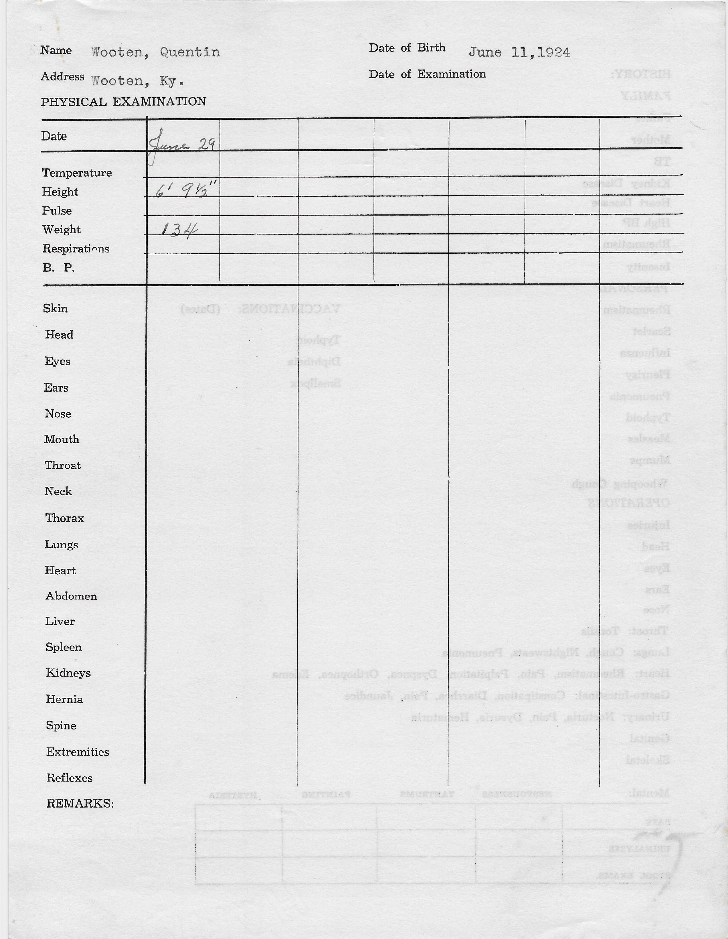 SCAN0317. June 29, [1940?] – Report of Quinten Wooton’s physical examination.