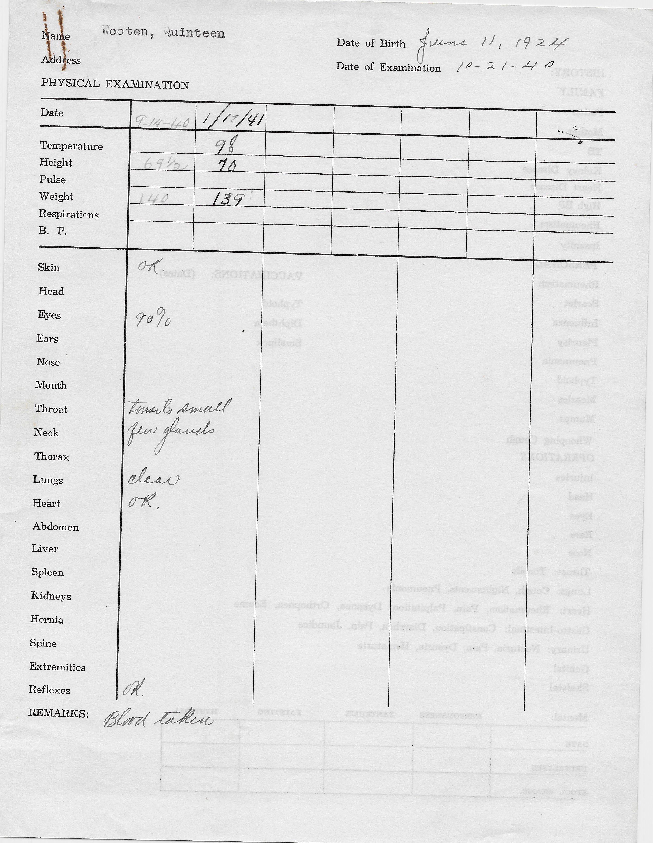 SCAN0318. October 21, 1940 – Report of Quinten Wooton’s physical examination.