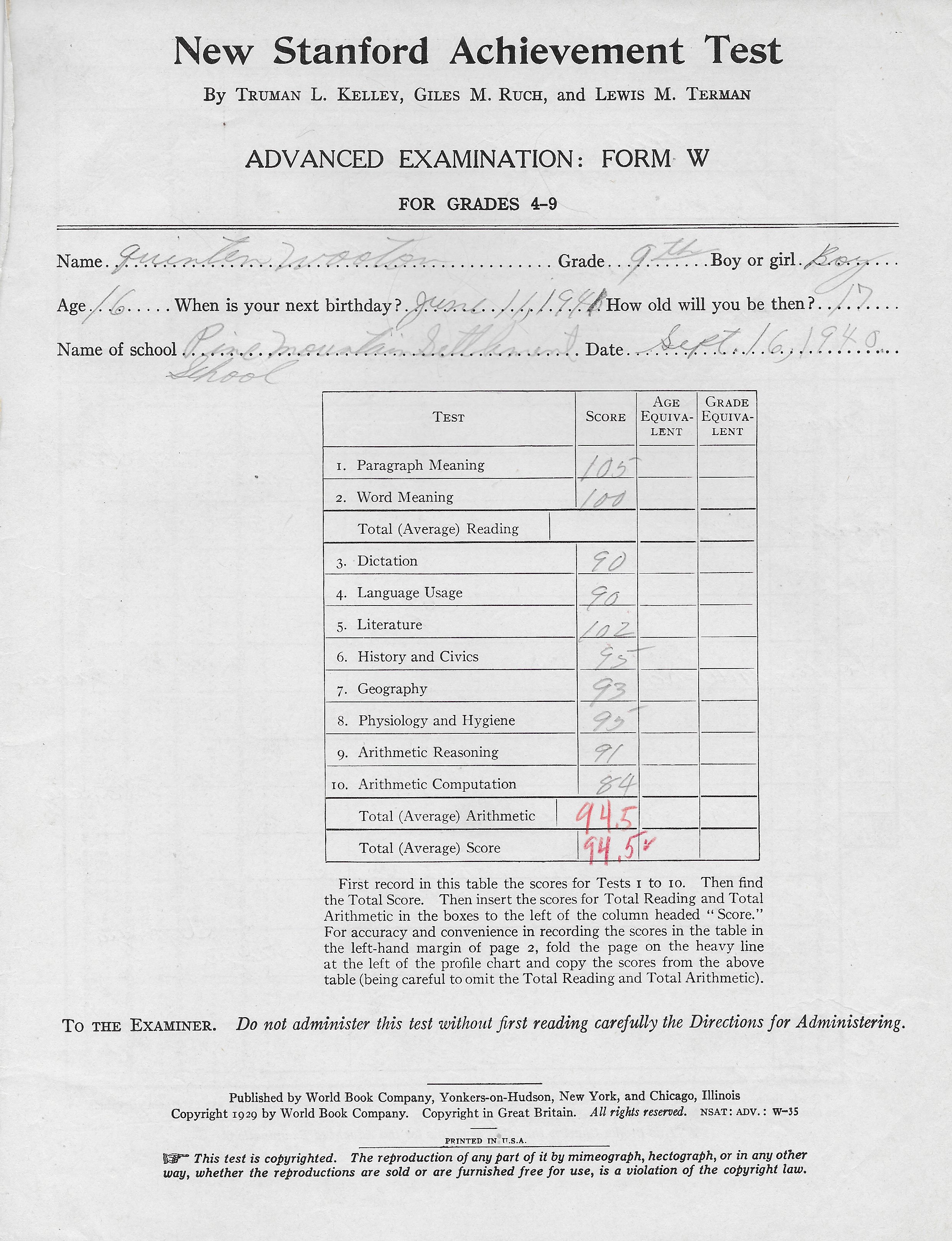 SCAN0319. September 16, 1940 – New Stanford Achievement Test (SAT) for Quinten Wooton, 9th grade, age 16. Lists scores for 10 tests and total score (average).