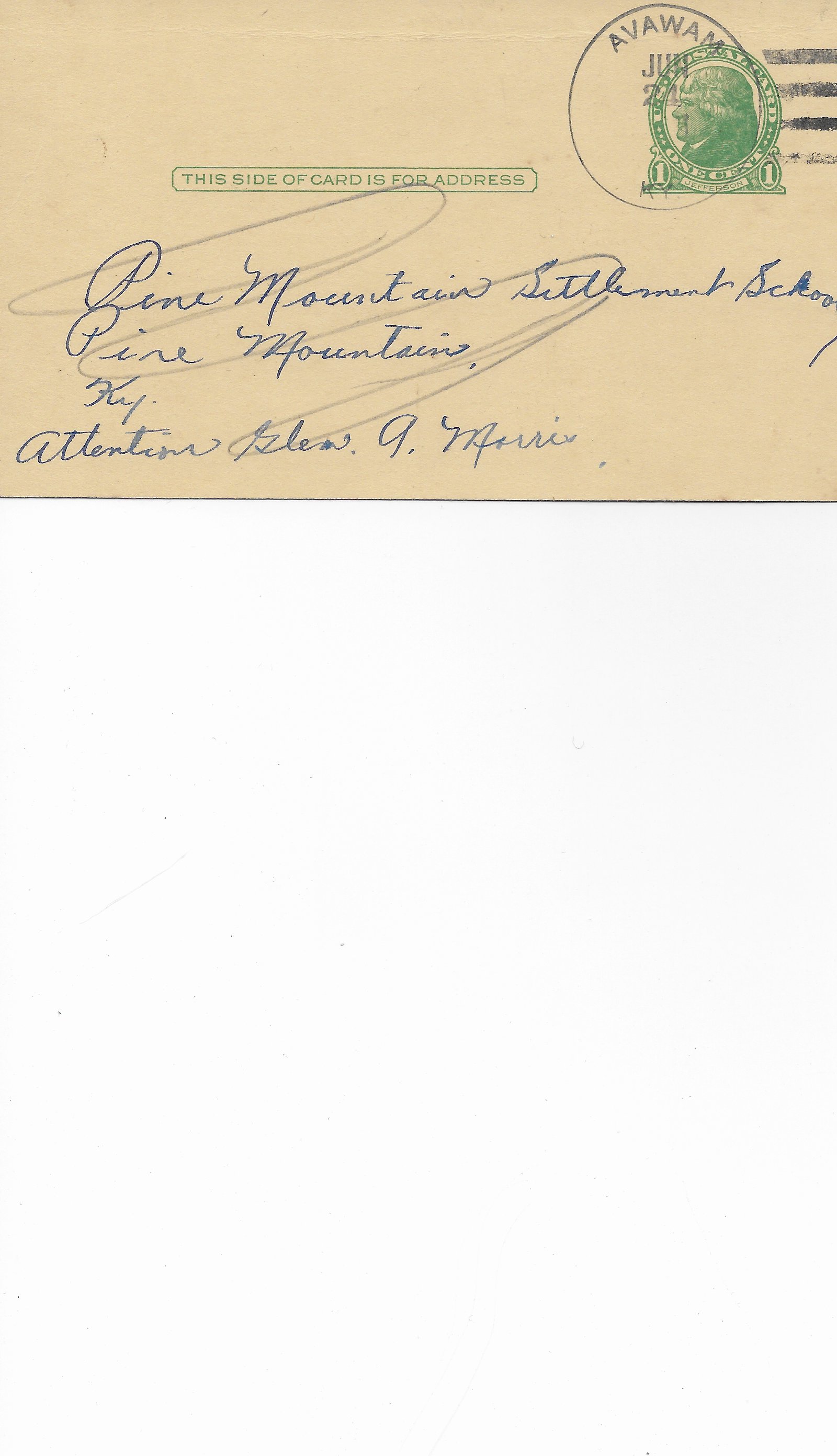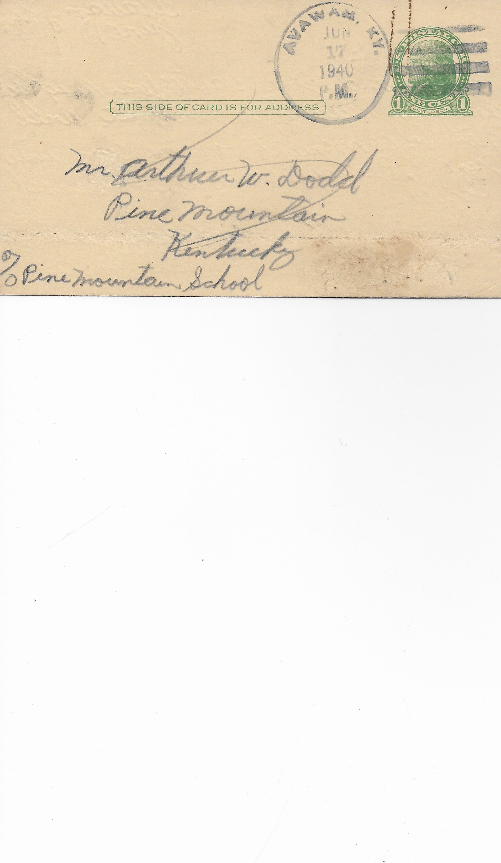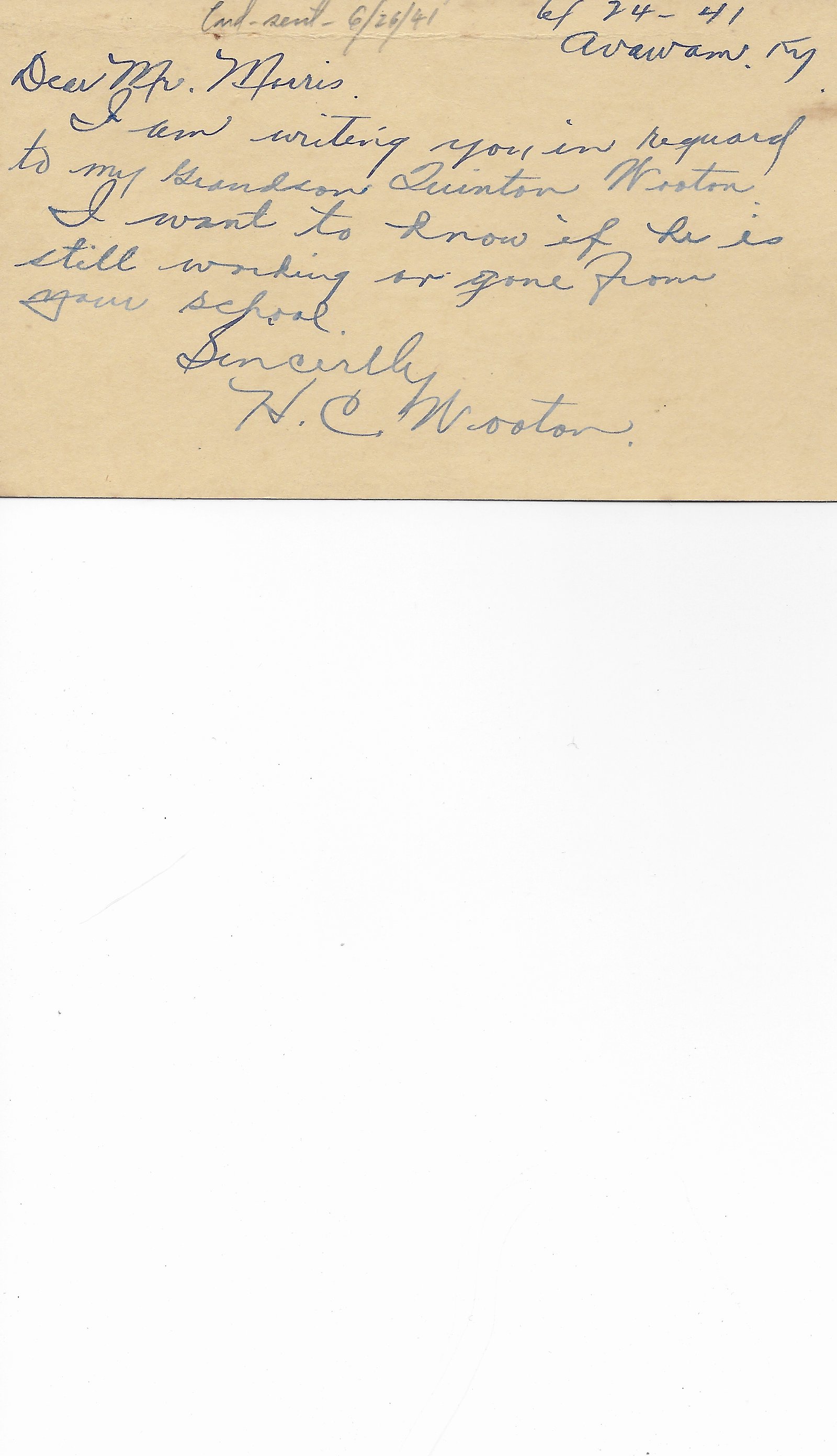 SCAN0321 and SCAN0322. June 24, 1941 – Handwritten postcard from H.C. Wooton, Avawam, KY, to Glyn Morris, asking if his grandson, Quinten Wooton, “is still working or gone from your school.”