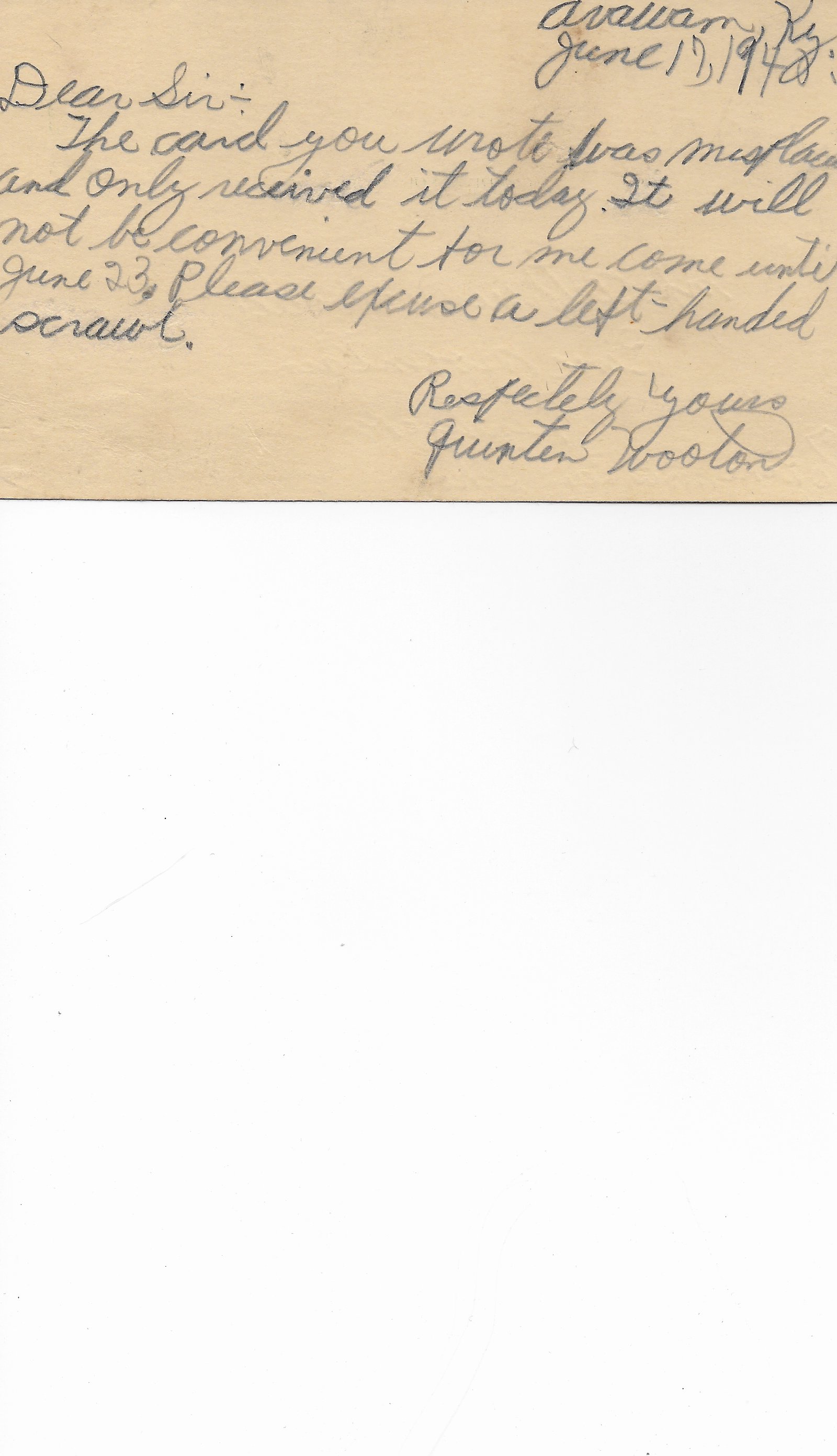 SCAN0324. Message side of handwritten postcard from Quinten Wooton, Avawam, KY, “It will not be convenient for me [to] come until June 23.”