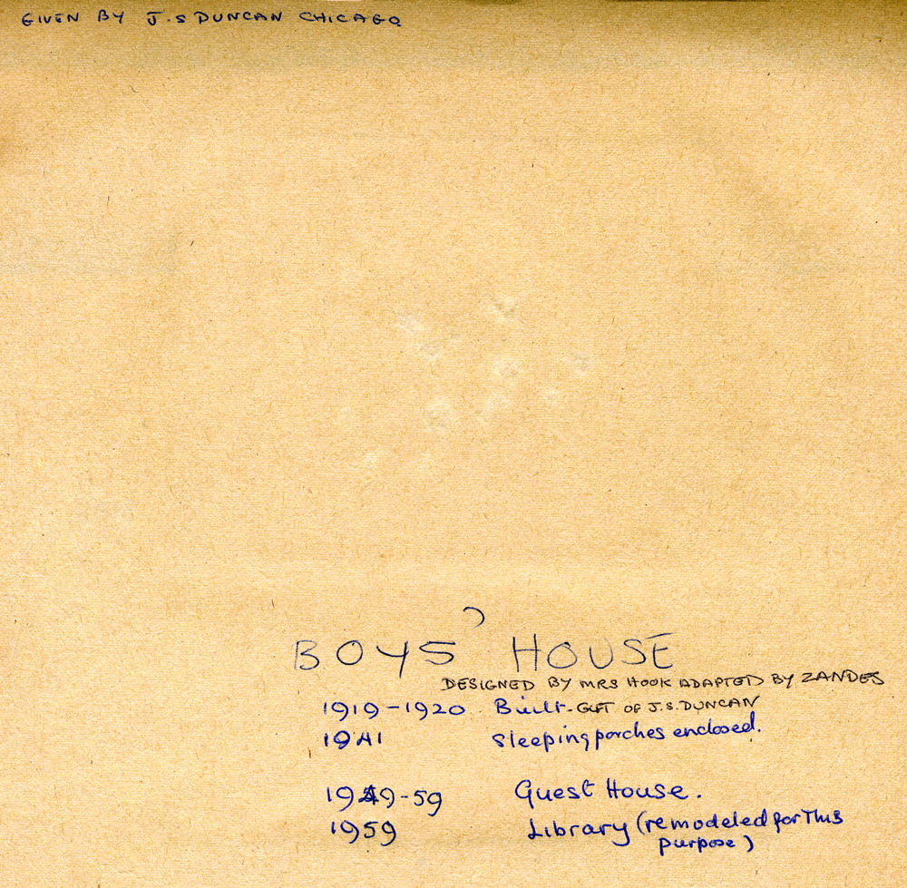 Boys’ House ; Pine Mountain Settlement School ; Pine Mountain, KY ; Harlan County, KY ; gifts ; J.S. Duncan ; Chicago, IL ; addressograph ; trustees ; Mary Rockwell Hook ; Ethel de Long Zande ; Luigi Zande ; physical structure ; balconies ; sleeping porches ; Library ; archives ; offices ; staff housing ; community outreach ; Environmental Education ; gymnasiums ; weaving rooms ; meeting rooms ; sheds ; facades ; living rooms ; stone steps ; playgrounds ; archival collections ; |