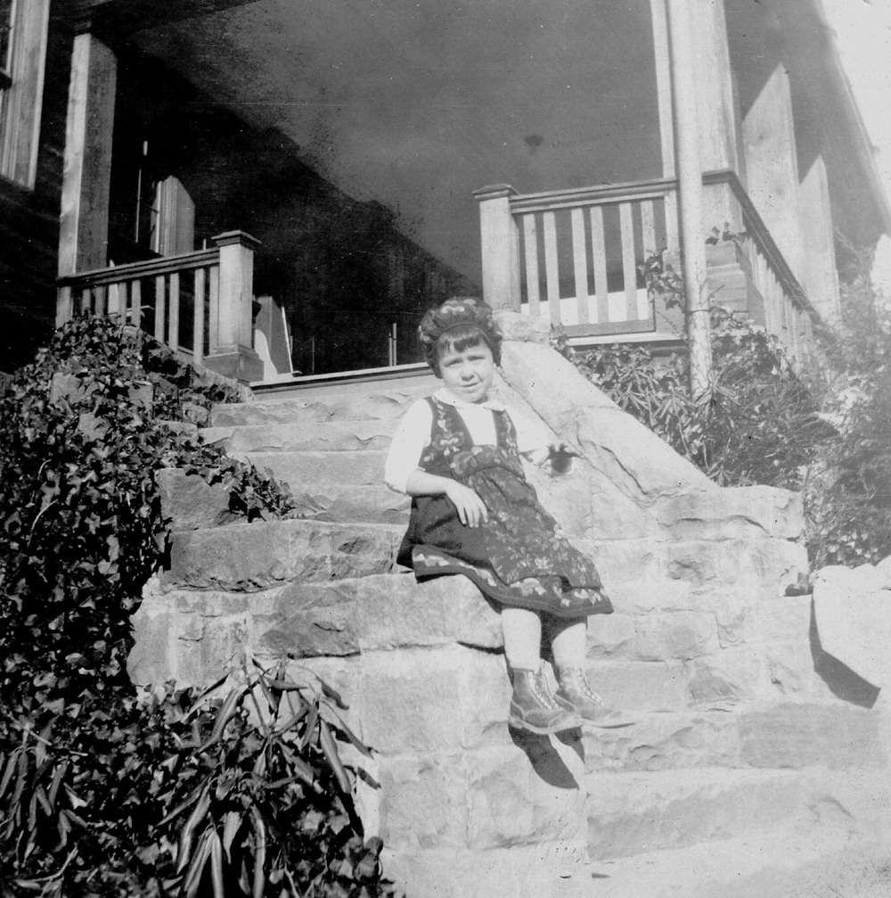 - Boy’s House. Exterior view of stair with small girl, seated. [II_08_boys_house_316b.jpg]