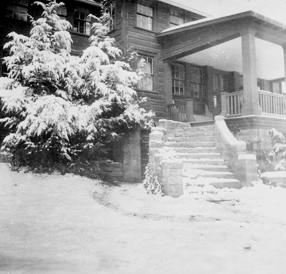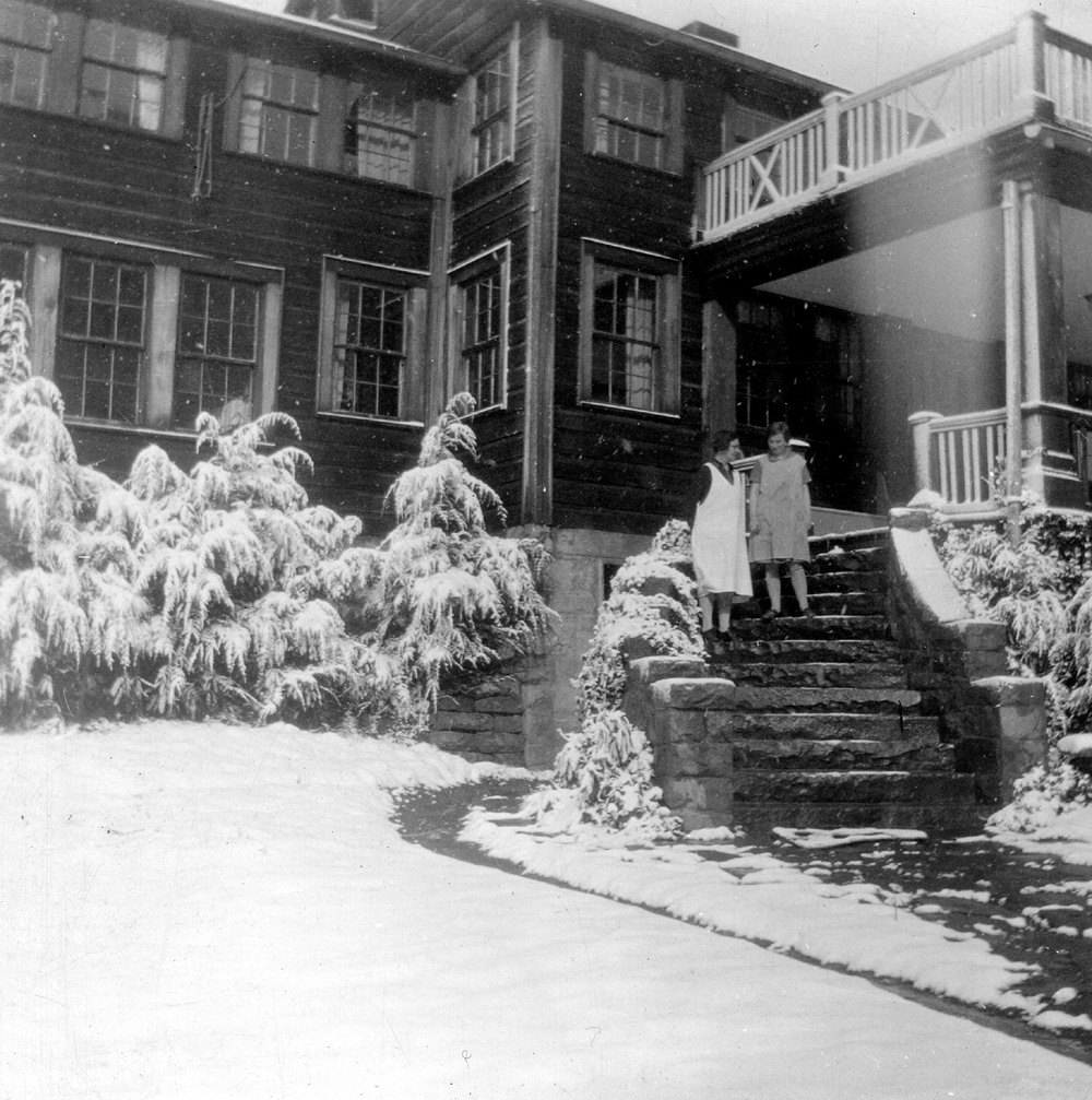 - Boy’s House in the snow. Facade view of center section. Two women on steps. [II_08_boys_house_322a.jpg]