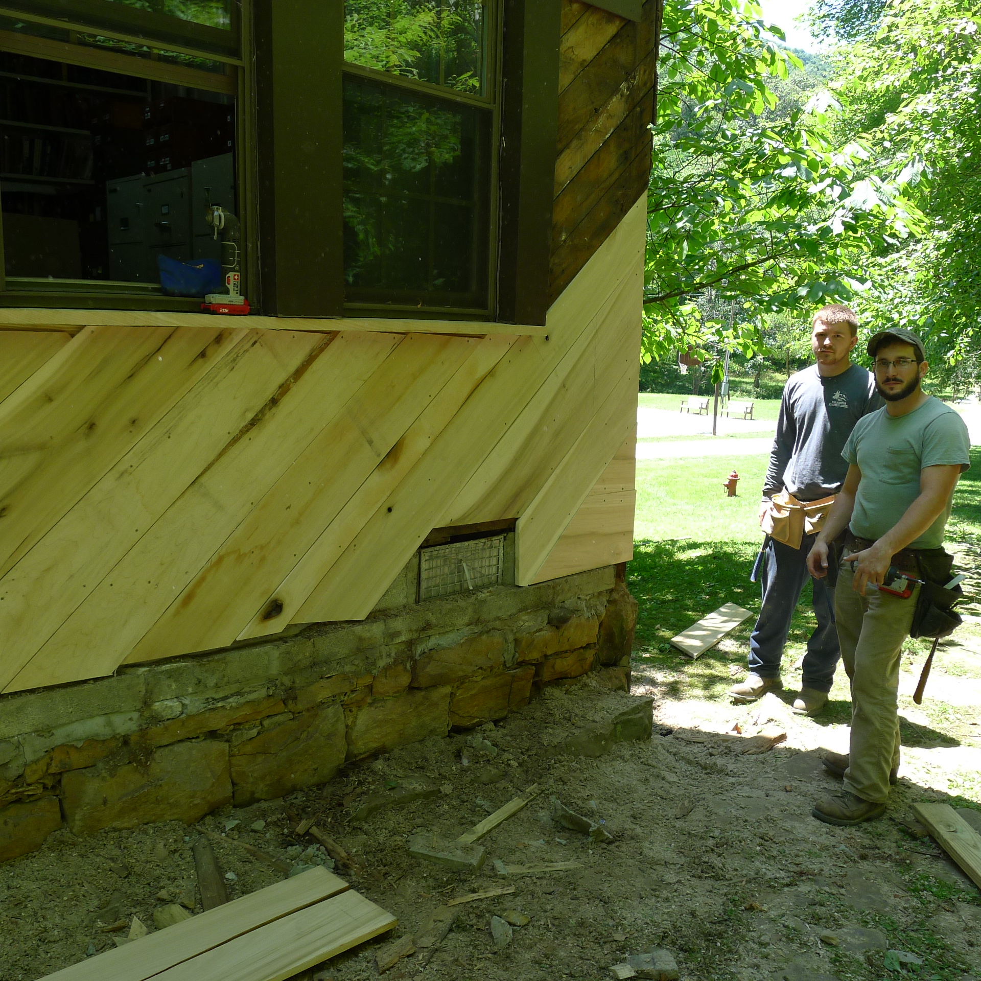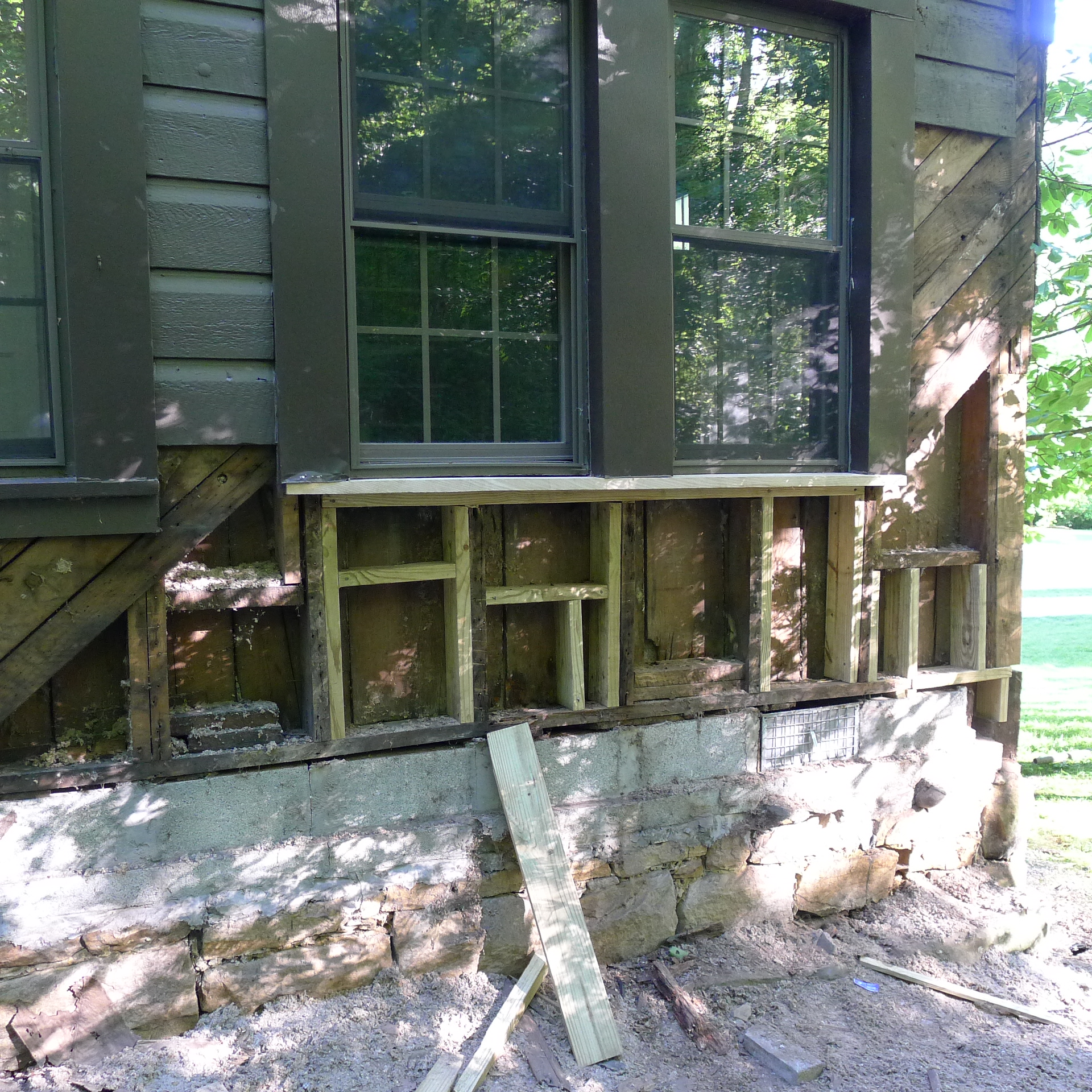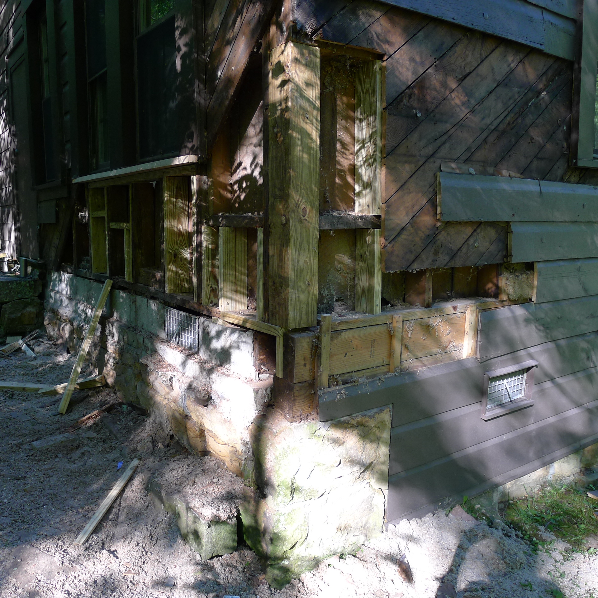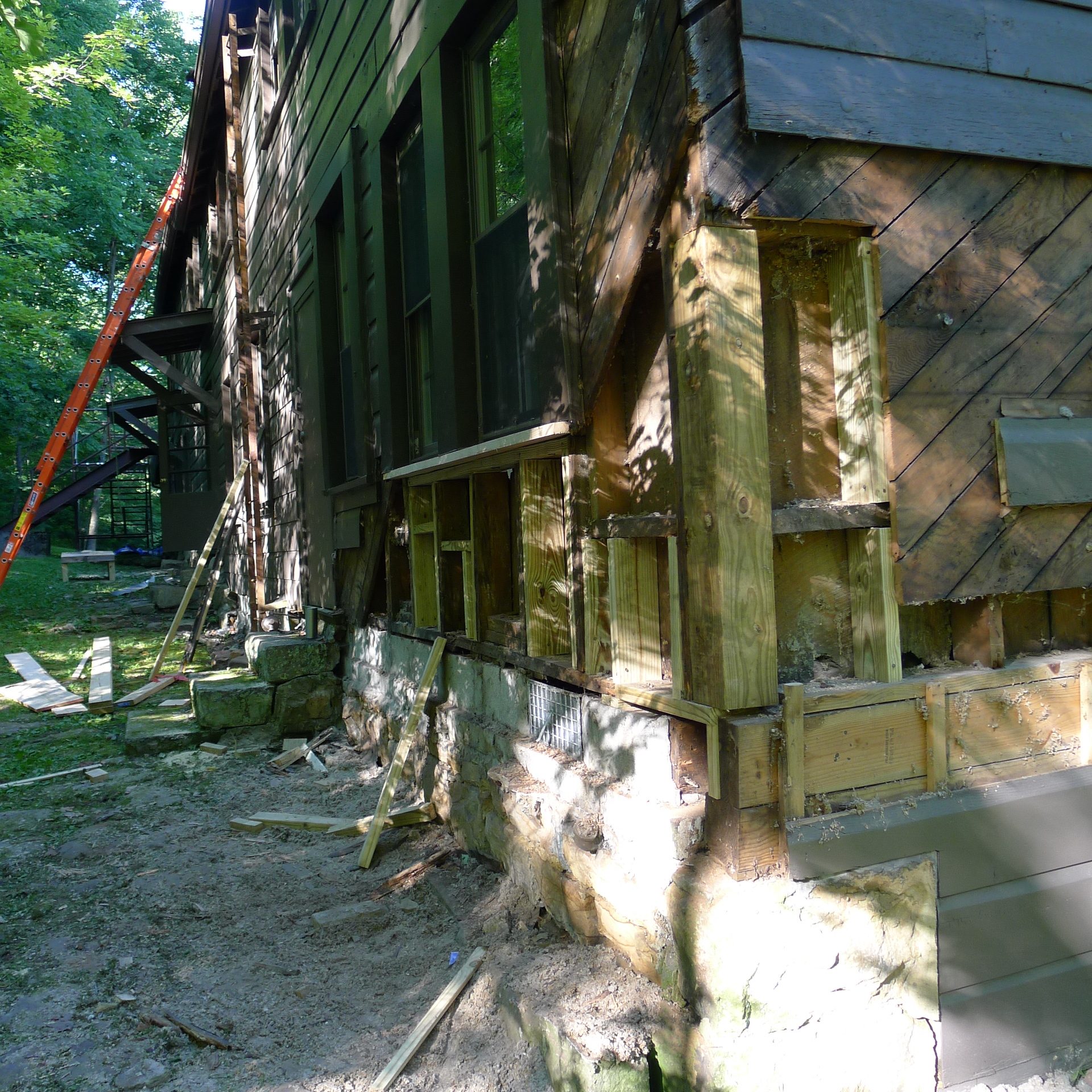 - 2017 Exterior damage to Northwest corner of Boys House under repair by T.J. and Mark.