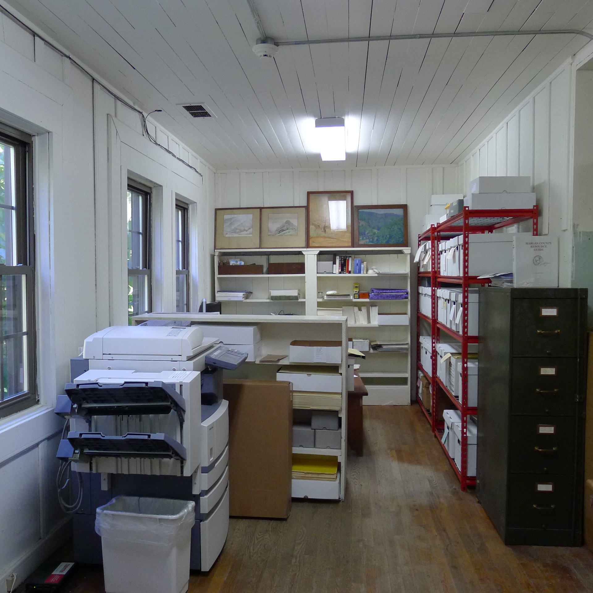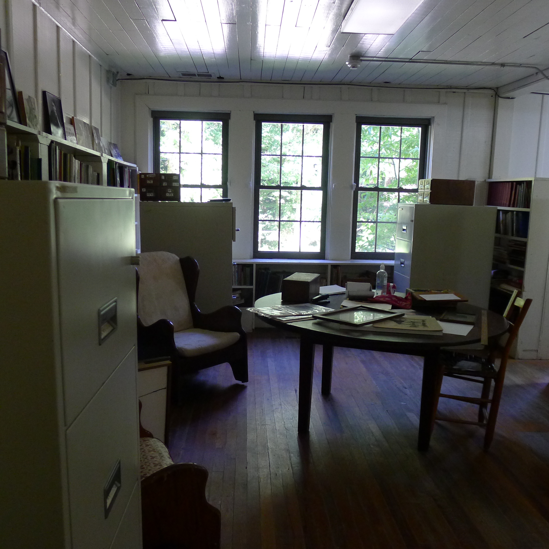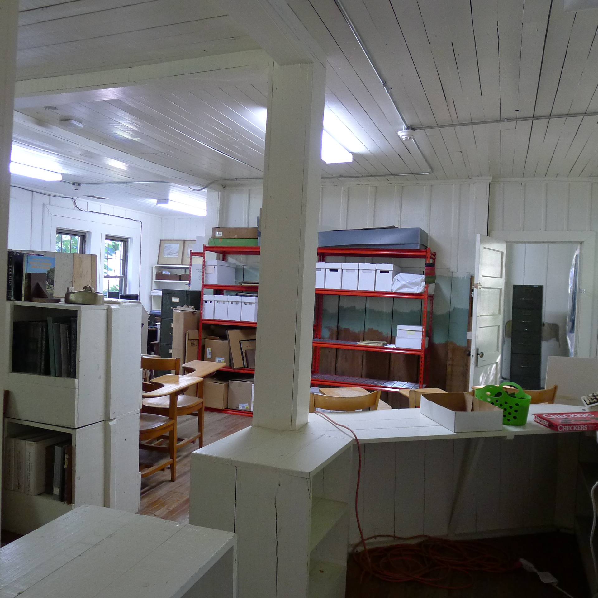 - View from reading room toward processing/work/collections area.Boys House. Archive/Library room.
