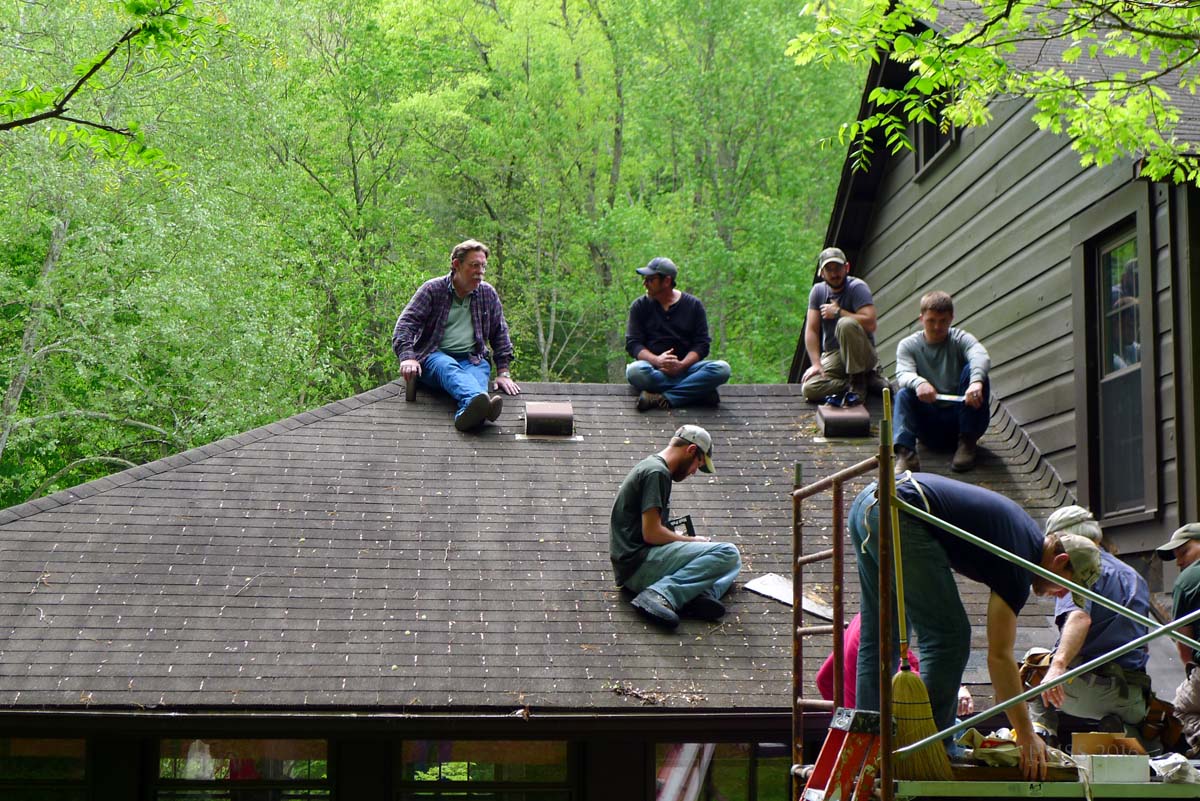 - 2017 Bob Yapp and Patrick Kennedy with workshop participants. Preparing the flashing on Boy’s House. Photo by HHW. [P1130847.jpg]