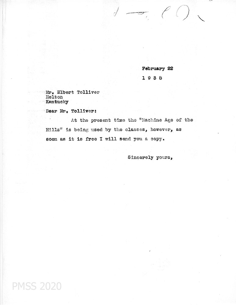 “[Identification of Item],” [Collection Name] [Series Number, if applicable]. Pine Mountain Settlement School Institutional Papers. Pine Mountain Settlement School, Pine Mountain, KY. |
