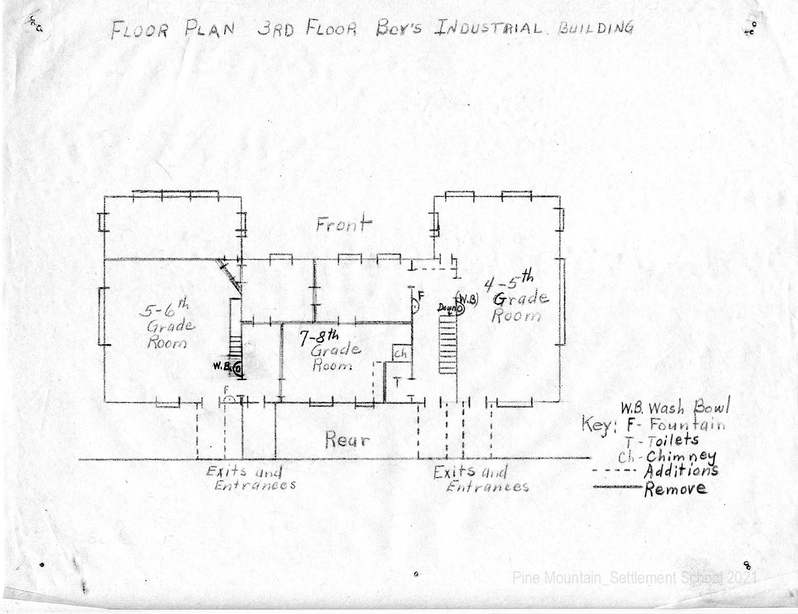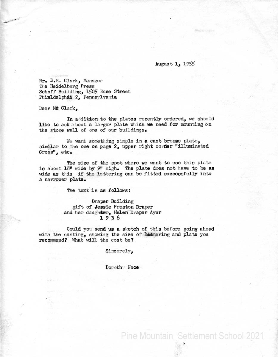 Draper Industrial Arts Building, was constructed to replace the Boy’s Industrial Building which burned in 1935. Constructed and formally named in 1936 the Jessie Preston Draper Building to honor the generous donation of Jessie Preston Draper and her daughter Helen Draper Ayer that funded the structure. The architect, Mary Rockwell Hook, the School’s appointed architect, designed the structure, perhaps strongly influenced by Darwin D. Martin, the Chair of the Board of Trustees who was a close friend of Frank Lloyd Wright. The construction of the much larger building took many months to gather funding and to construct and remains the central building on the Pine Mountain Settlement School campus for instruction and workshops.