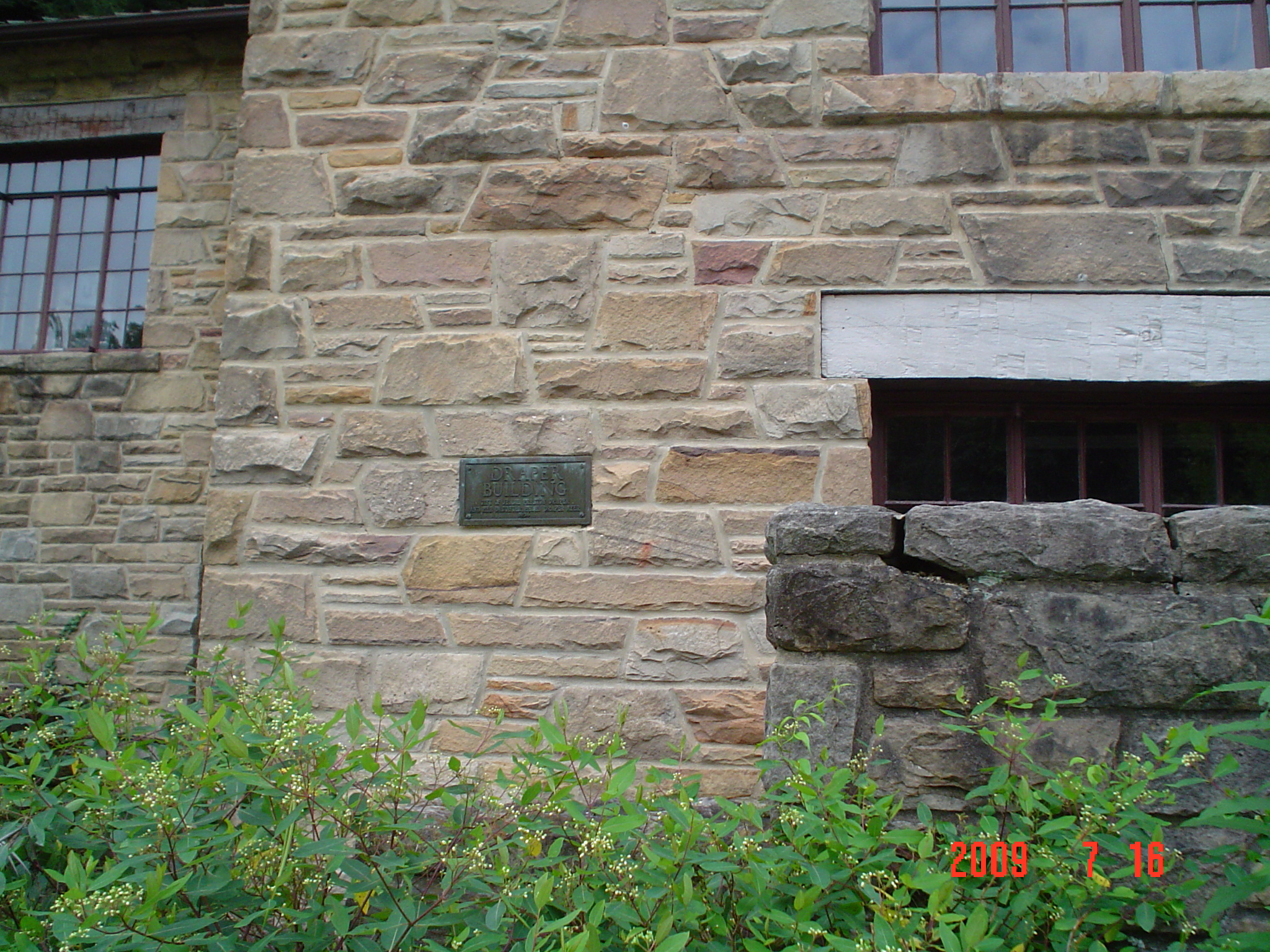 The basic structure of the building is rectangular in shape and today comprises three stories. Typical of the designs of Mary Rockwell Hook, the original building was designed for flat roofs and castellation for both the central structure as well as the west wing and was only a two-story structure. [See below: When the remodeling was initiated in the 1940s the flat roofs were removed and an additional story was gained for the building by adding a board and batten third story. A new metal roof was installed on the central structure in 2011.] She later added the gabled roof and extended the design to include the woodworking area. The signature of the center building is the yellow cut stone which dominates the facade of the structure and that includes a two-tiered exterior stair that leads directly to the second level. To the left of the central structure is a one-story wing that today continues to house the woodworking shop. Gable roofs covers both the west wing and the central structure. On the lower level, planned as a mechanics area, are three garage doors that provide access to one long room with a poured concrete floor.