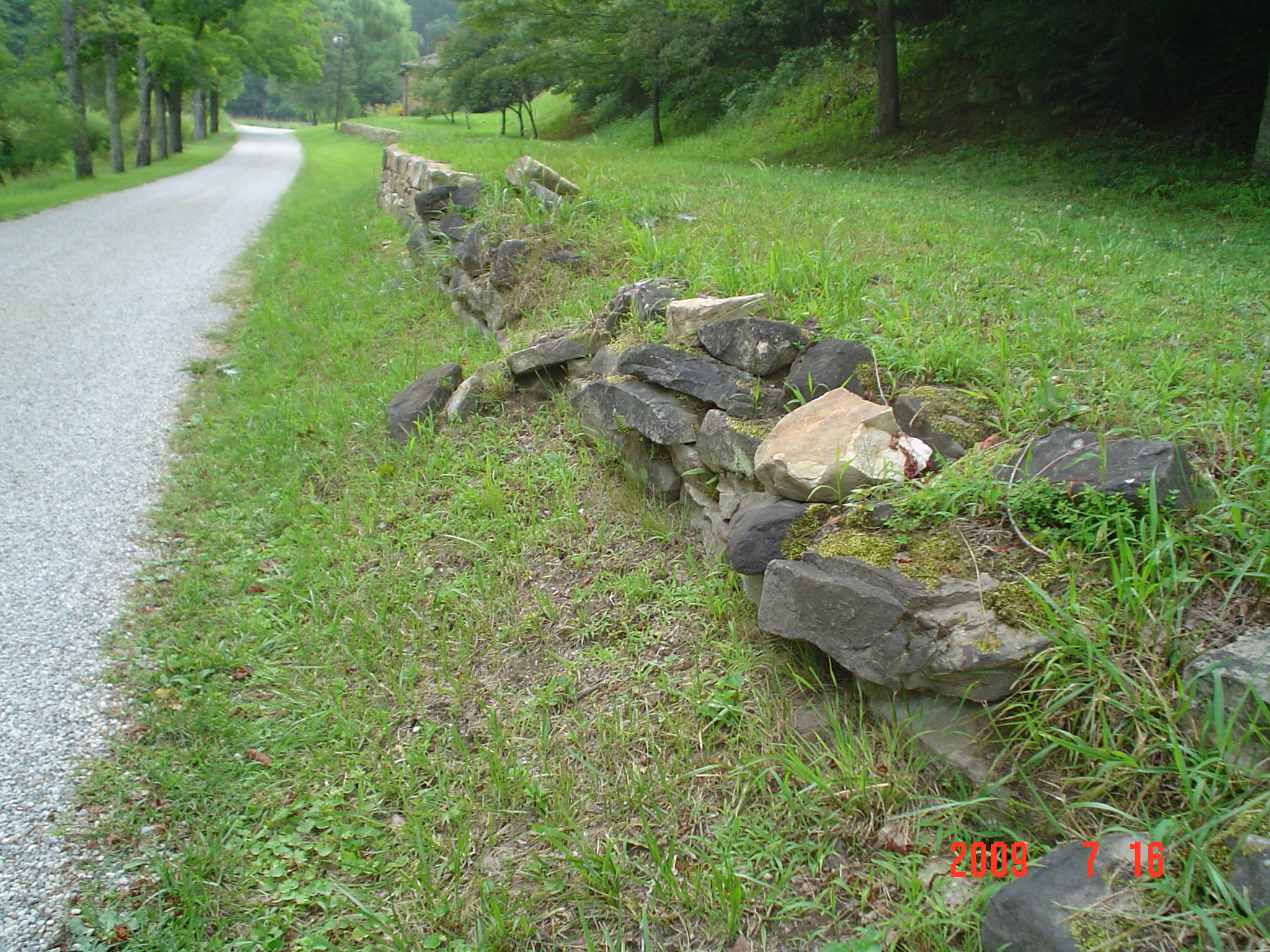 - Rockwall before dry-stack reconstruction on main entry road bordering Isaasc’s Creek. rockwork_058_draper_old_new_wall