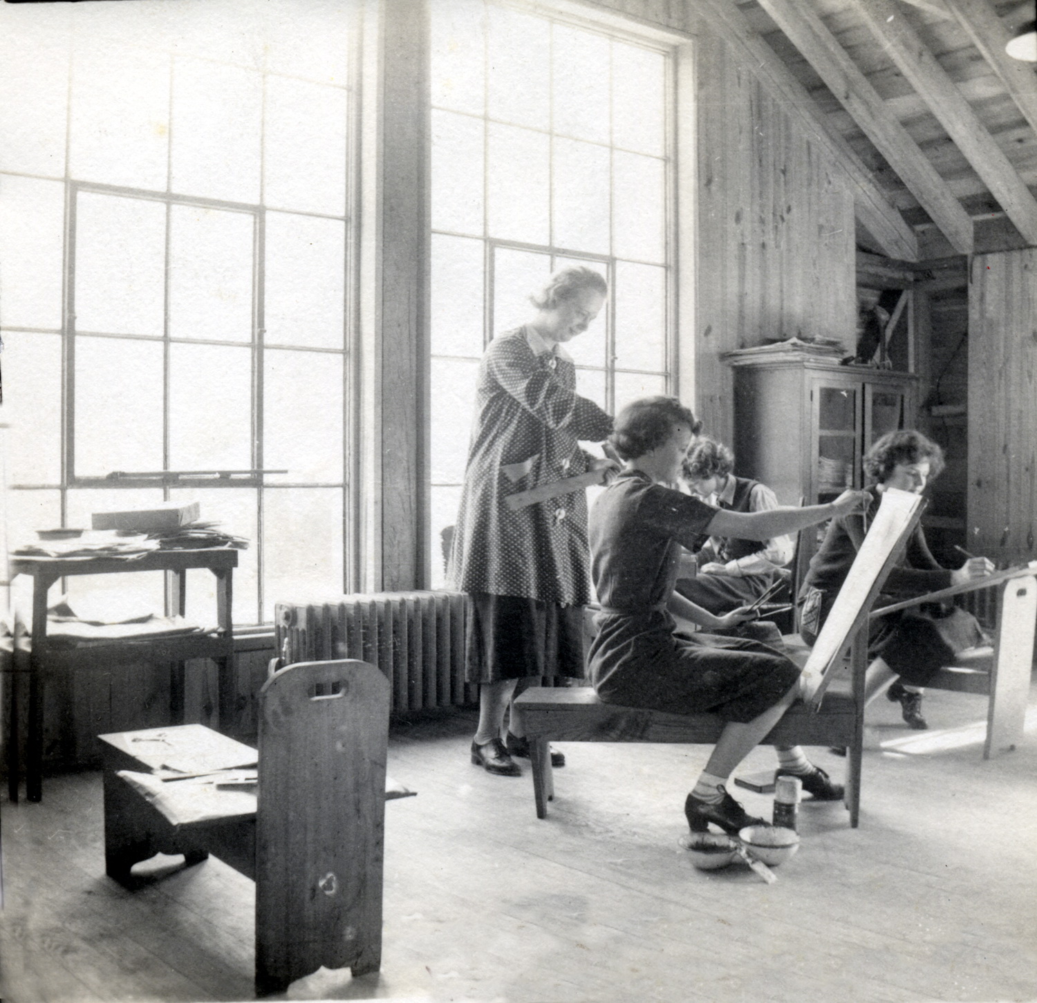 - Vrena Ploeter, Art teacher at PMSS in top floor of Draper Industrial, 1937, with Bonnie [?] Ayers and two other students. X_100_workers_2561_mod.jpg