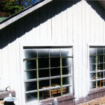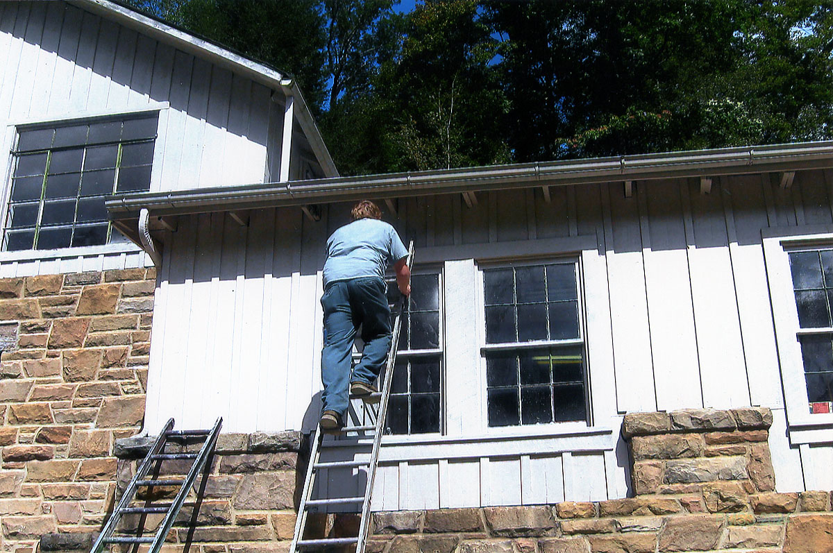 A 1970s photographic record of the reconstruction and replacement of wood-rot and the painting of the exterior of the DRAPER INDUSTRIAL ARTS Building (1936). Designed by Mary Rockwell Hook, the building was heavily used as a multipurpose classroom building during the Boarding School years and later by the Community School programs. Maintenance areas and industrial training courses were generally taught on the ground level. A wood-working shop on the west end of the building has been in continuous use since the construction. Now it houses various classrooms for educational offerings for the visiting schools and a large and exemplary weaving studio on the third floor.