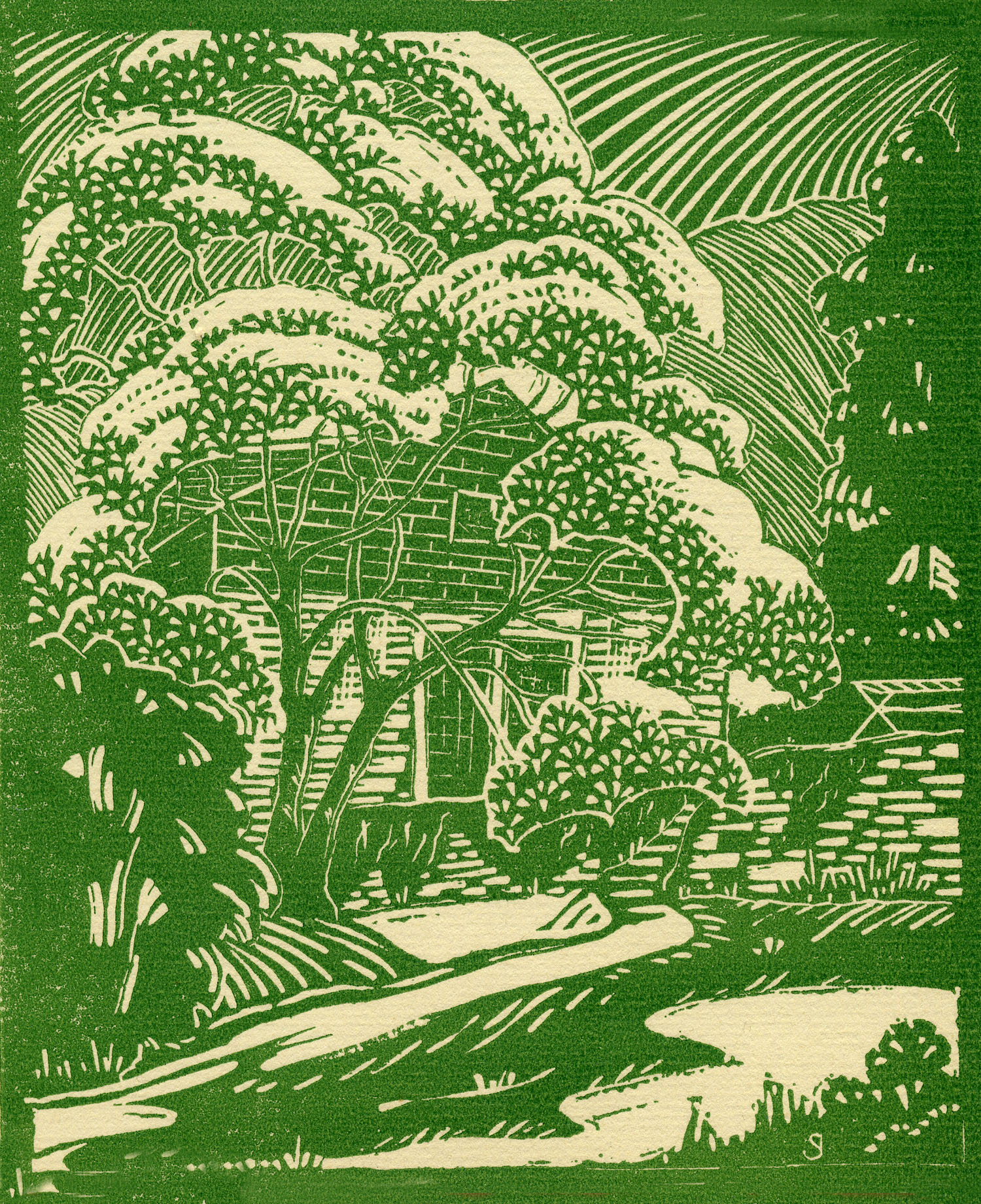 - 1938 Calendar. Linoleum block print by John Spelman III. Far House I [?] or Zande House, Terrace side, at PMSS