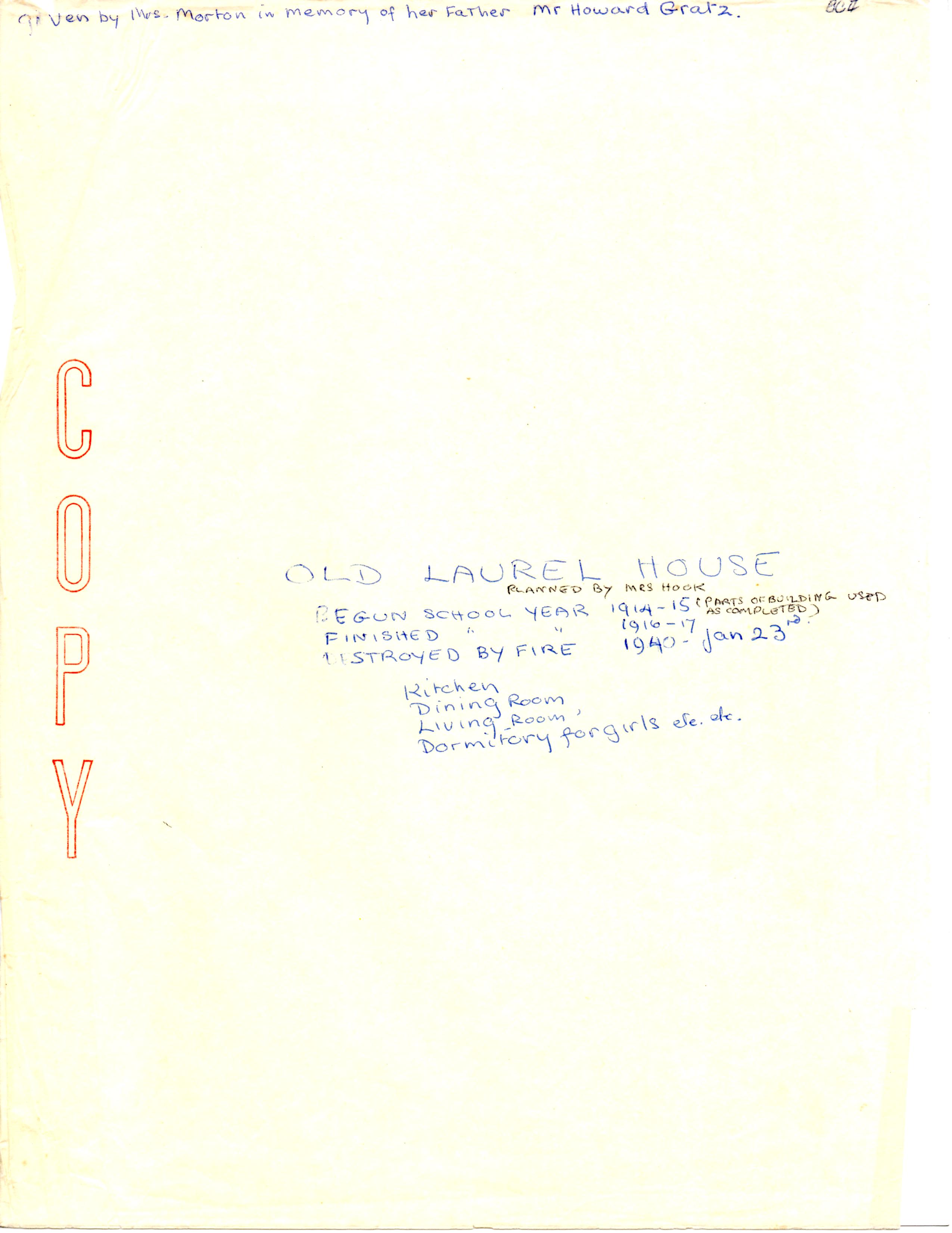 Note: Mary Rogers gives the year of the Laurel House I fire as 1940. The author of this “rememberance ” incorrectly gives the year of the fire as 1939.