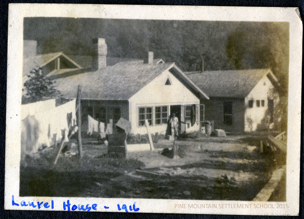 In 1917 Laurel House was built on Pine Mountain Settlement School campus to serve as both a dormitory and a dining hall for children and staff who were at the Pine Mountain Settlement School, (the school having been founded just 4 years before by William Creech, Katherine Pettit and Ethel DeLong.) The building, according to former staff, was a massive structure with a huge dining hall which had double wings radiating out from it that housed the kitchen-pantry in one wing, and laundry facilities in the other. The second story of each wing included dorm rooms and living space for 15 girls and at least 6 of the women teachers. Near the kitchen there was a courtyard with water flowing into a pool from the mountain branch near the building, used for washing vegetables for food preparation. There were arbors and flower beds included in the stately courtyard.