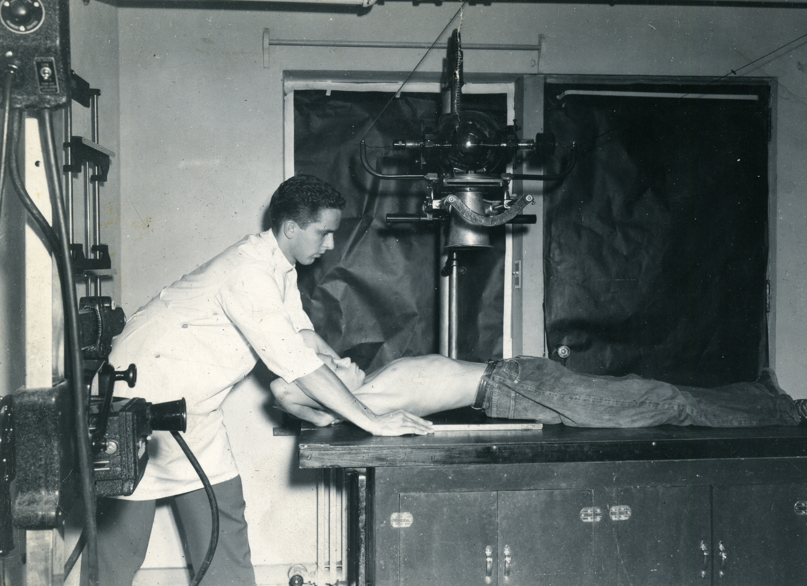 - Dr. Brown in the new PMSS Hospital at West Wind. Patient on X-Ray table. Grace Rood Album. [rood_045]