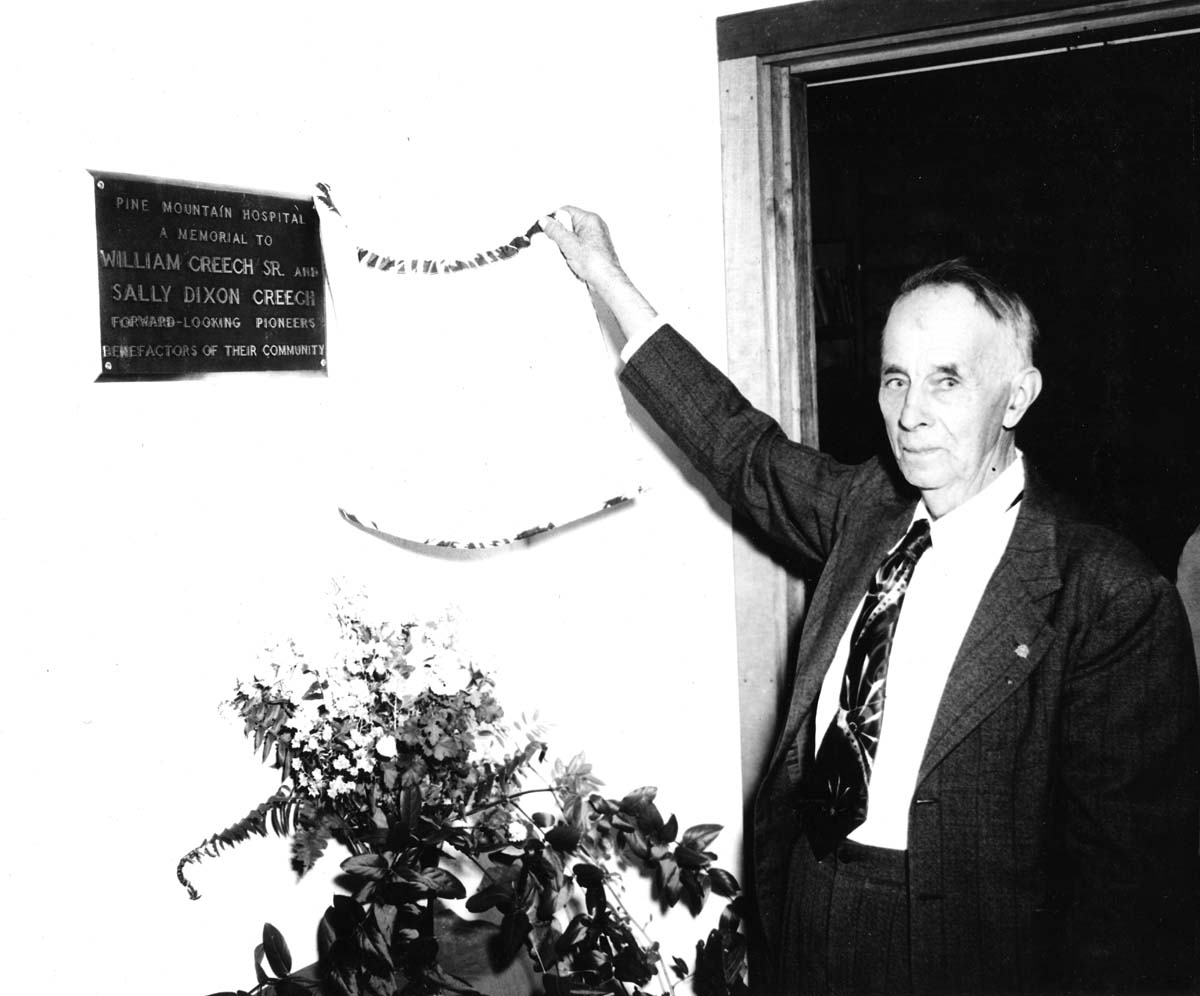 The hospital was dedicated c. 1949 as the William and Sally Creech Memorial Hospital. A plaque was created which now is located in the lower far right west-facing room in the building.