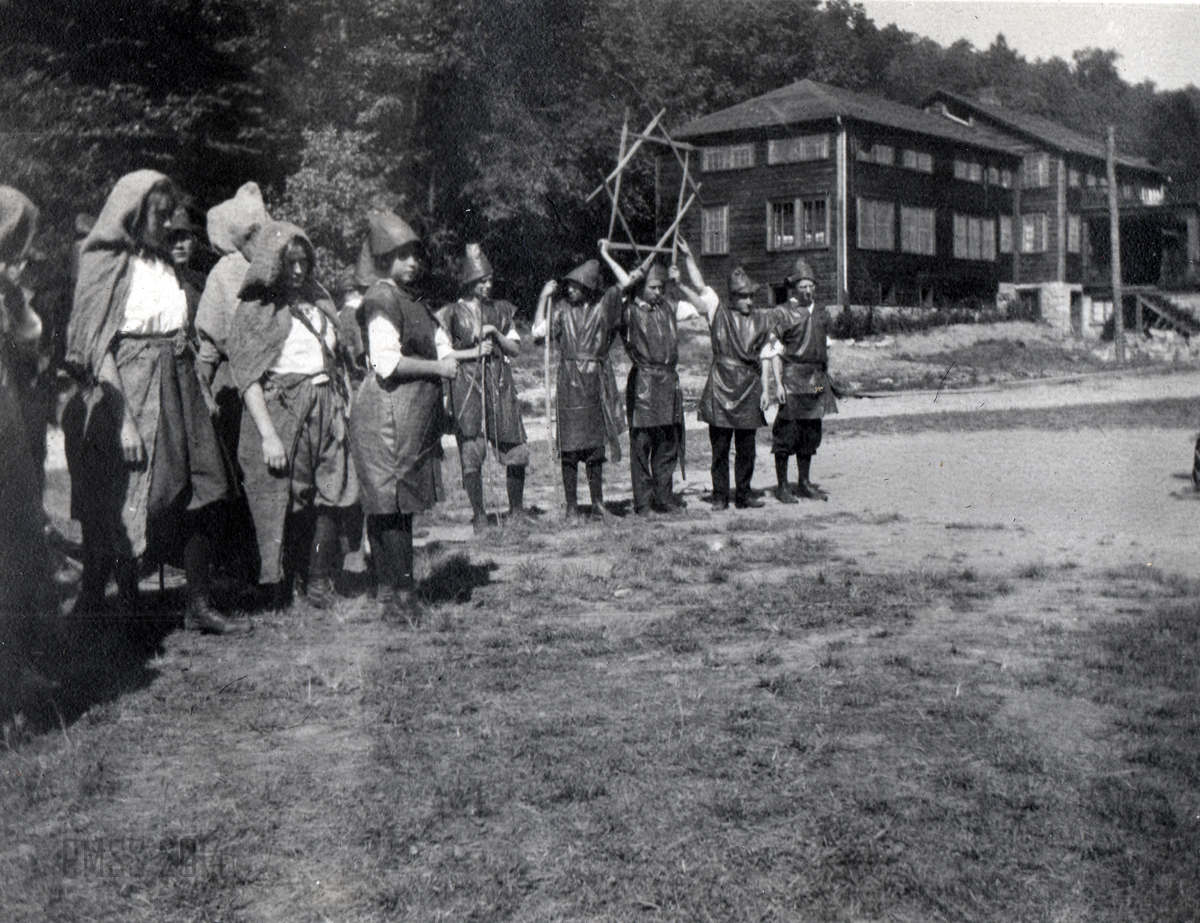 - Jack’s Gap. Katherine Pettit (older woman with hat to left of image) and Ethel de Long (back against pine tree) and children at Jack’s Gap, above PMSS. [X_099_workers_2524a_mod.jpg]