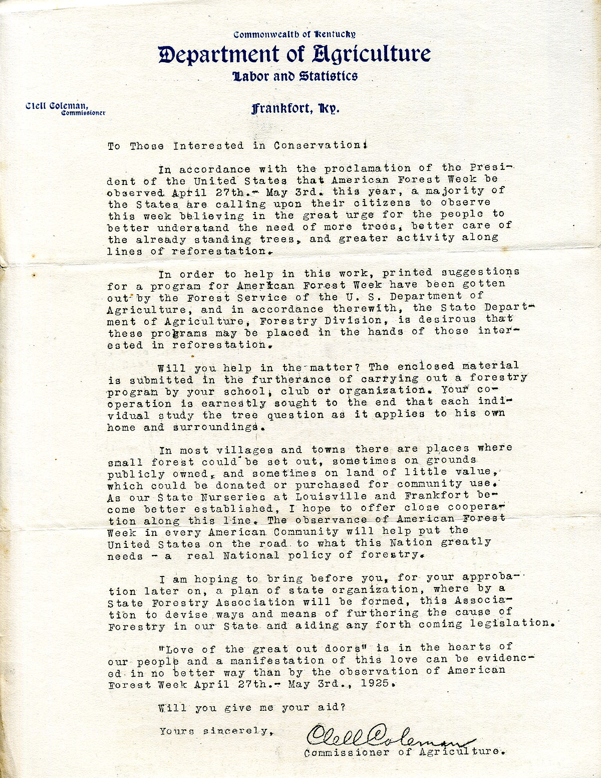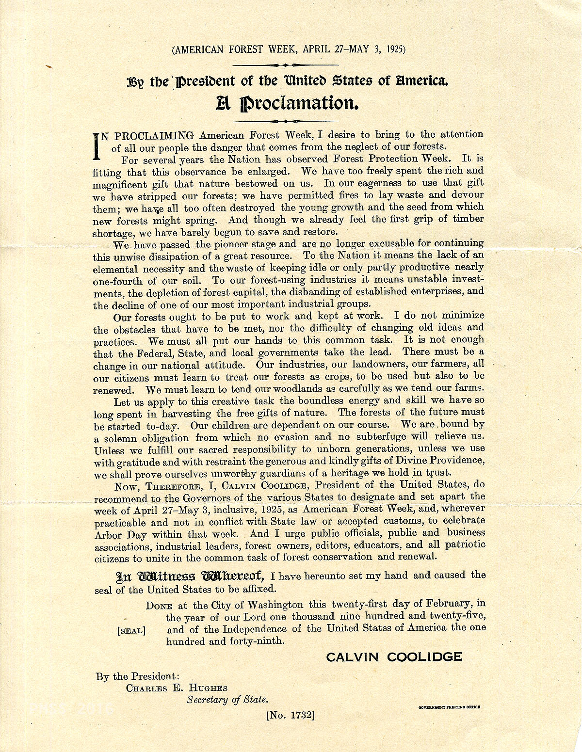 By 1925 the President of the United States had issued a Proclamation that declared April 27- May 3rd to be “American Forestry Week”.  He stated that “I desire to bring to the attention of all our people the danger that comes from the neglect of our forests.” His proclamation was an enlargement of the “Forest Protection Week” that had been in place for several years.  It was clear that all was not right with American forests in the 1920’s, what Coolidge called “unwise dissipation of a great resource.”