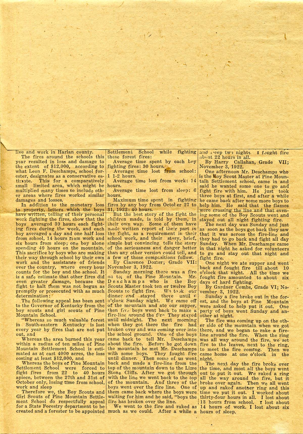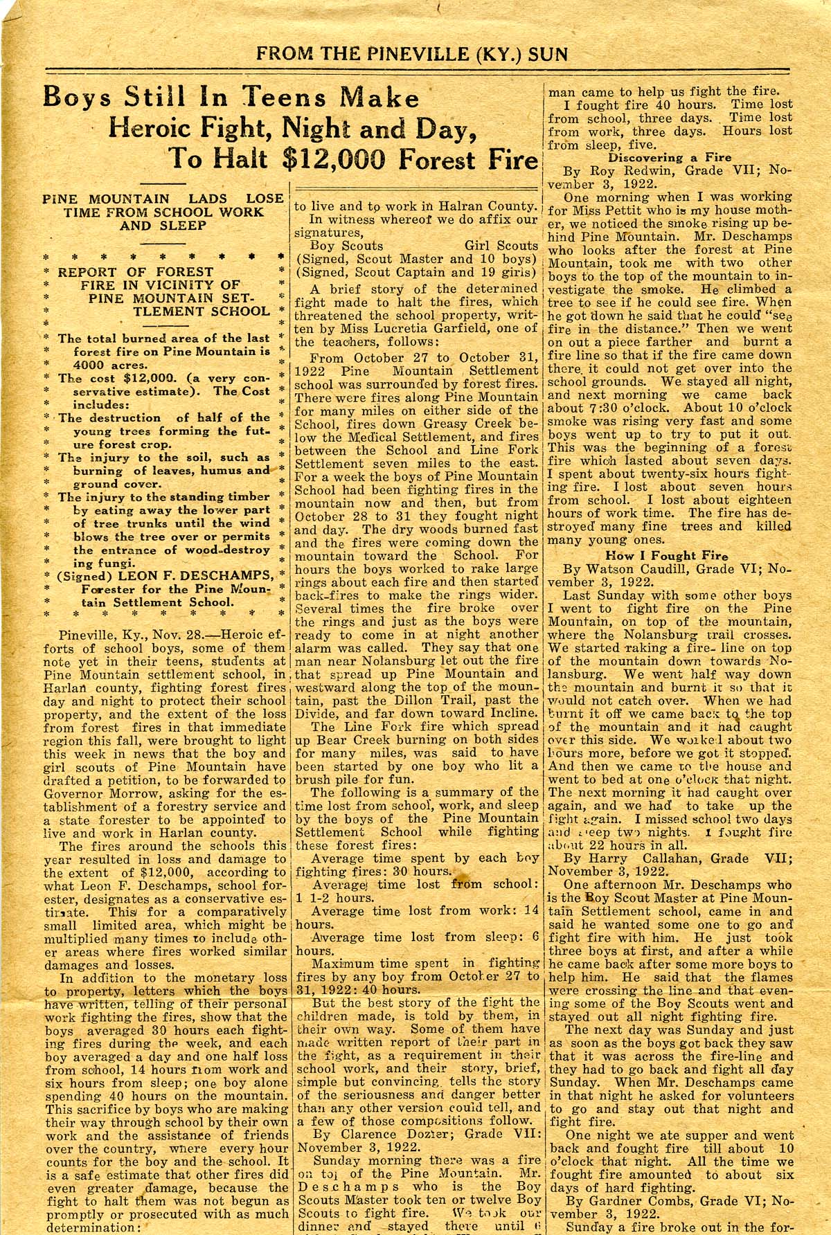 On  November 28, 1922,  the mountains around Pine Mountain Settlement School caught fire and threatened the entire community.  As reported in the Pineville (Ky.) Sun the terrible fire created a serious re-assessment of the forests and the threat of fire to part of the School’s important resources.  10 students at Pine Mountain, led by Leon Deschamps, the school forester and also the leader of the local Boy Scout troupe put forward a petition which they hoped to forward to Kentucky’s Governor Morrow. The petition was also signed by 19 girls, members of the local Girl Scouts and supplemented by a letter from their Scout Captain, Miss Lucretia Garfield, grand-daughter of President Garfield, who was on the staff of the School as a teacher and Scout leader from 1919 to 1922. The petitioners asked that the Governor establish a forestry service and a state forester to be appointed to Harlan County.  As part of the petition each of the boys who fought the fire, for an estimated 30 hours each, wrote of their personal experience fighting the fire in individual letters attached to the petition.