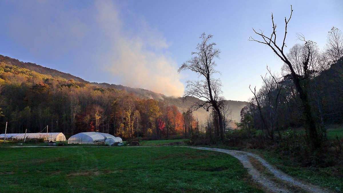Forest fires along the Little Shepherd Trail above Pine Mountain School. Oct. 29, 2016. High-tunnels for crops in the foreground. [p1130242]