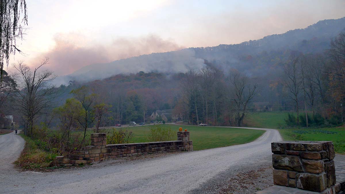 In October 2016  the Pine Mountain was again on fire.  A series of small fires deliberately set along the Little Shepherd Trail grew into large fires that crept down the mountain. Today no small boys were sent up to meet the growing danger, but the small staff watched warily as the forest cleared its under-story and discussions centered on the process of making ready for the seeds of Spring. Yet, with each increase in the wind the observers grew more anxious and small groups went into the forest to combat the flames as they steadily marched down the mountain toward buildings.  Shortly a misting rain fell and everyone sighed relief yet many paused to consider and to wonder what it is in our common human community that still finds pleasure in setting things afire.