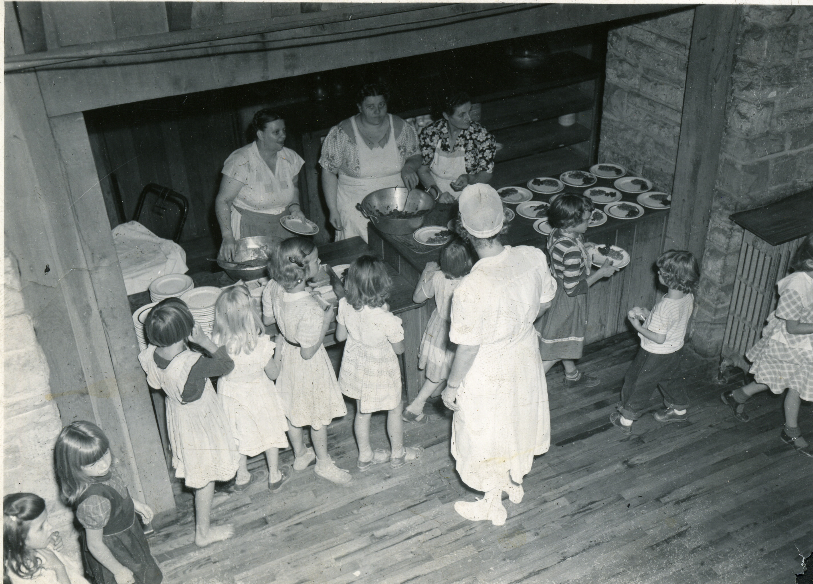 In the dining room, the beautiful multi-purpose tables from the very earliest years are still in constant use. The tops of the tables tilt to full upright and become a seat which can then be used on the dance floor when folk dancing is introduced following the meal. The hickory cane-bottomed chairs are still found throughout the dining room.  Notoriously easy to up-end, the chairs now are more frequently heard hitting the floor as children are more accustomed to heavier seating. Another observation is that the noise level of the children has gradually increased and echoes off the walls of the dining room.  The excited and animated conversations are also often punctuated by some child leaning too heavily on the tilt-top of the table causing it to “slap” back down on the base. As children compete to be heard, the loud voices fill the room. The auditory experience in the dining room has changed dramatically from the earlier years when children were quickly quieted. Shouting and raising the voice in the dining room was monitored by all present and quickly corrected by staff and by the children themselves.