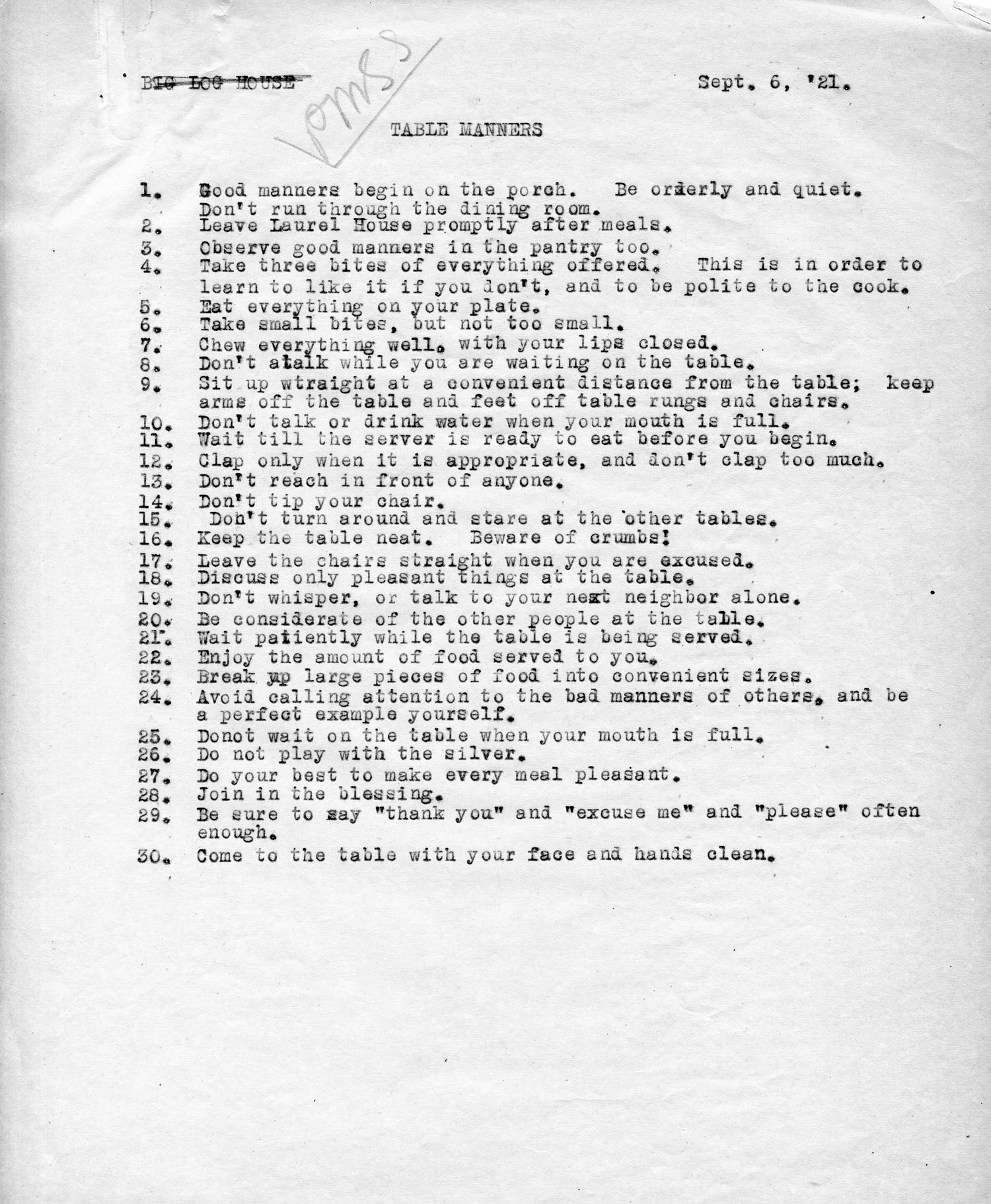 1. Good manners begin on the porch. Be orderly and quiet. Don’t run through the dining room.