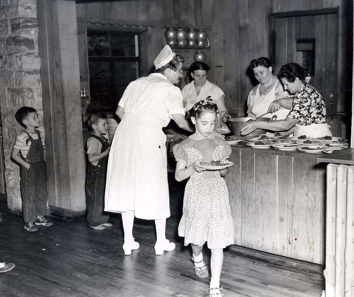 During the Community School years (1949-1963)  at Pine Mountain, dining began to more closely follow that found in grade schools throughout the country.  However, as can be seen in the photograph that introduces this blog, the tables were still set for dining with plates, saucers, silverware, and napkins properly placed for each student. Each child would take their plate through a “cafeteria” line where they received the main offering of the day.