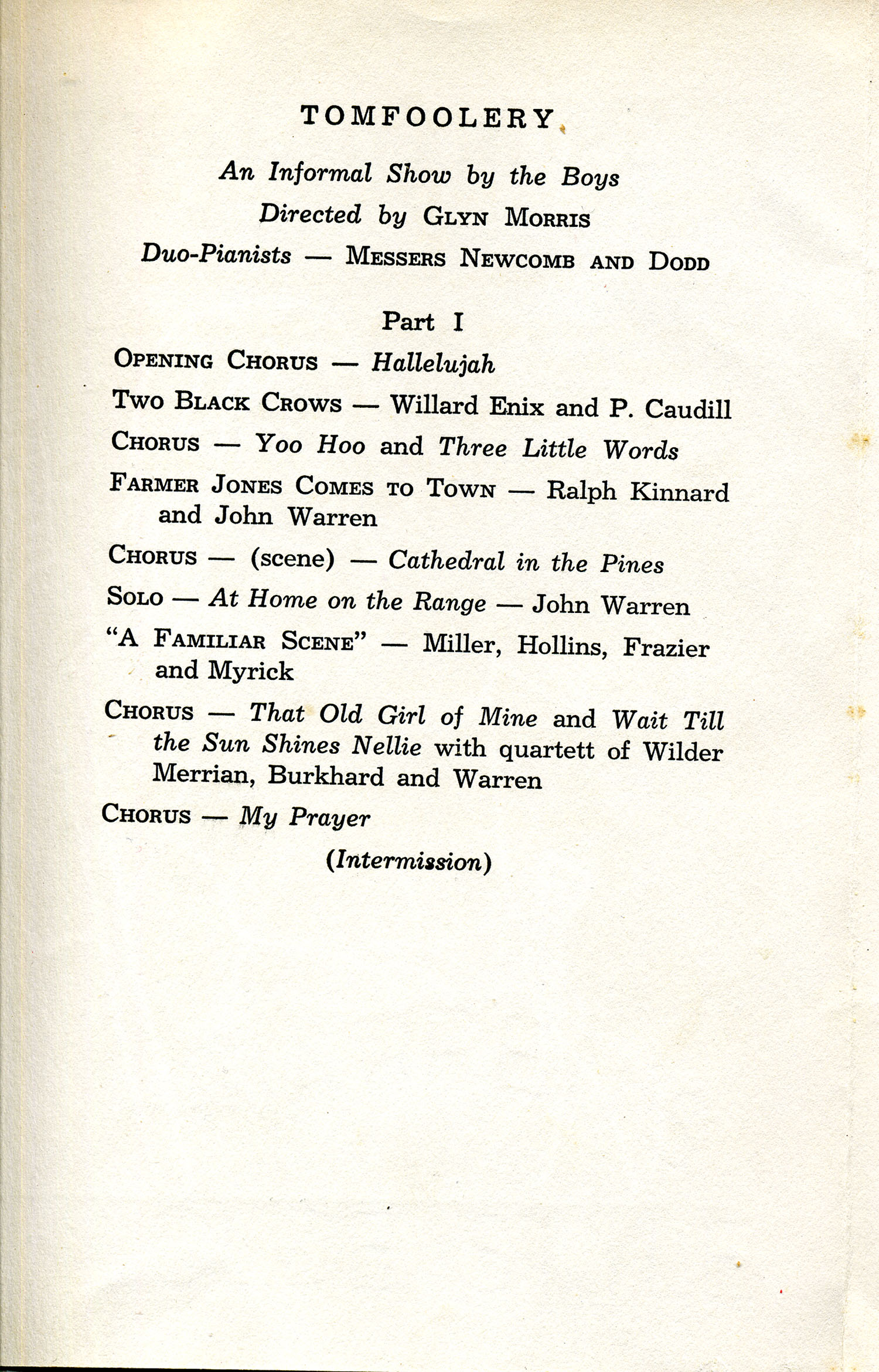 Part I OPENING CHORUS — Hallelujah TWO BLACK CROWS — Willard Enix and P. Caudill CHORUS — Yoo Hoo and Three Little Words FARMER JONES COMES TO TOWN — Ralph Kinnard and John Warren CHORUS — (scene) — Cathedral in the Pines SOLO — At Home on the Range — John Warren “A FAMILIAR SCENE” — Miller, Hollins, Frazier and Myrick CHORUS — That Old Girl of Mine and Wait Till the Sun Shines Nellie with quartett [sic] of Wilder, Merrian, Burkhard and Warren CHORUS — My Prayer