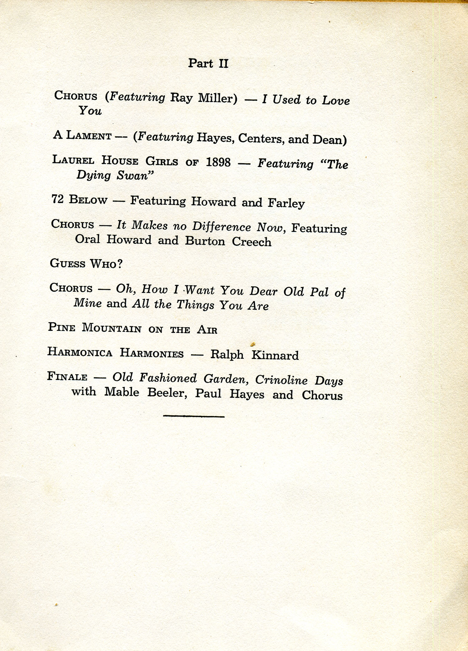 CHORUS (Featuring Ray Miller) — I Used to Love You A LAMENT — (Featuring Hayes, Centers, and Dean) LAUREL HOUSE GIRLS OF 1898 — Featuring “The Dying Swan” 72 BELOW — Featuring Howard and Farley CHORUS — It Makes no Difference Now, Featuring Oral Howard and Burton Creech GUESS WHO? CHORUS — Oh, How I Want You Dear Old Pal of Mine and All the Things You Are PINE MOUNTAIN ON THE AIR HARMONICA HARMONIES — Ralph Kinnard FINALE — Old Fashioned Garden, Crinoline Days with Mable Beeler, Paul Hayes and Chorus