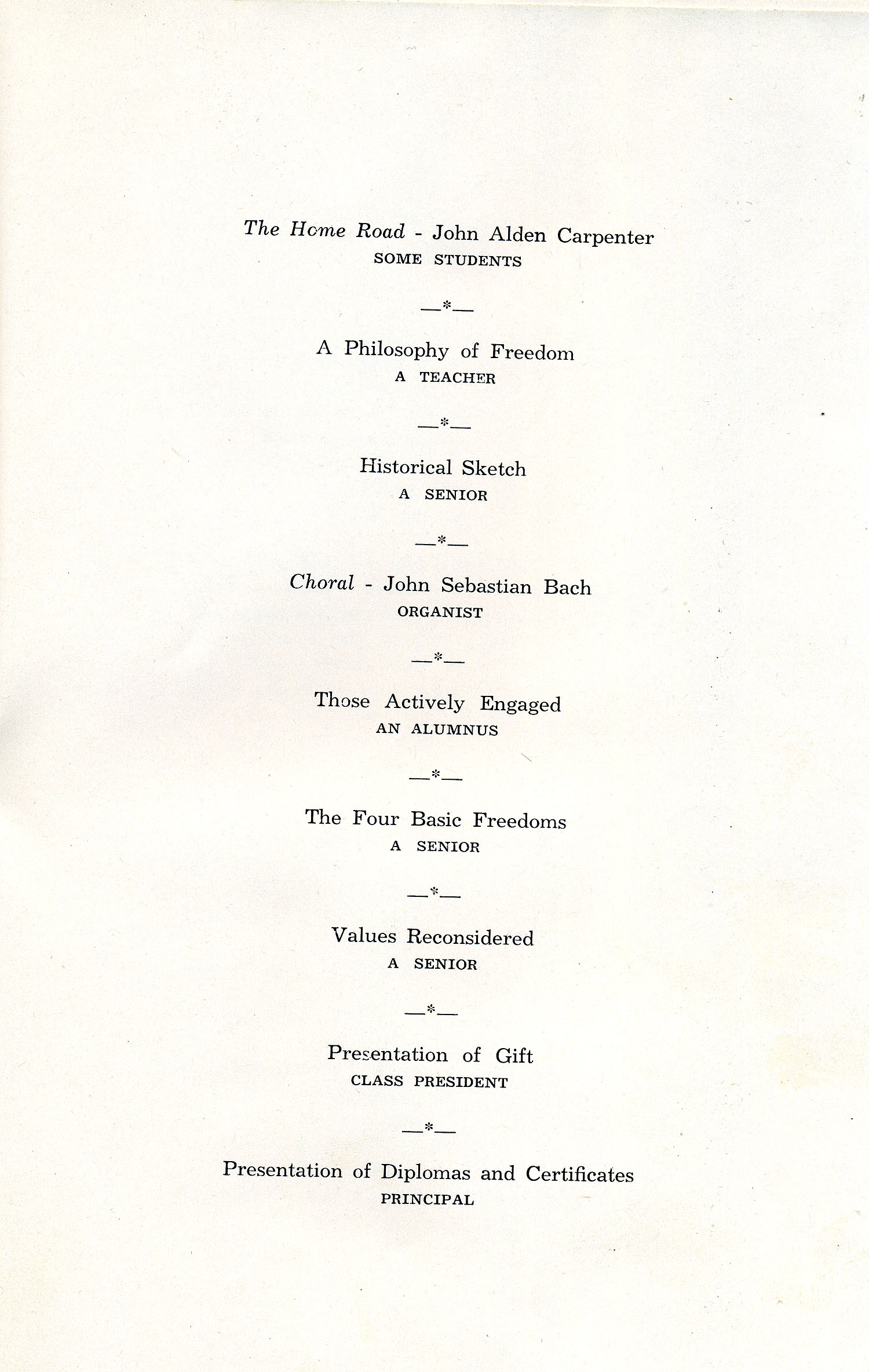 When we look for the word in our dictionaries we find that the Latin, “liber” l-i-b-e-r means free in the sense of generous, liberate – to set free from bondage, liberty — a synonym for freedom itself. We speak of having had a liberal arts education.  Our years in high school have been just that, a liberal education or a freeing education. What has been set free? Our minds. They have been unlocked, opened. They are free to travel just as far as our sympathies and understandings reach. We have dipped into a number of fields of knowledge, perhaps we have had little more than an introduction, but we have a speaking acquaintance, we know just as surely as when we are presented to a new friend, that here or there we have found something that bears further acquaintance, something that must be cultivated. So it is that we all find our special interests, and abilities, and we are prepared to keep right on advancing, studying, putting into practice, working in school, or out of school to use that individual talent which we have found to be ours to the end that we create something which is our worthy contribution to the sum of good things that men have done and will do.