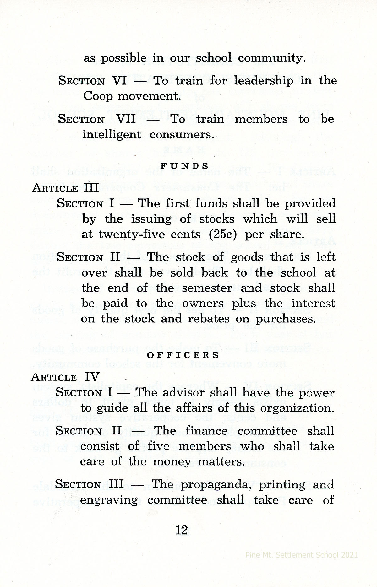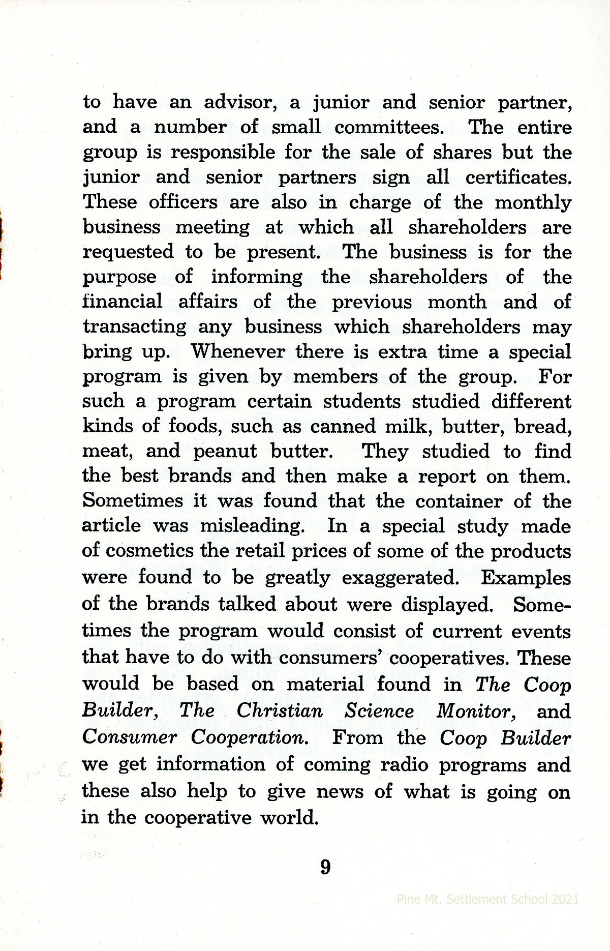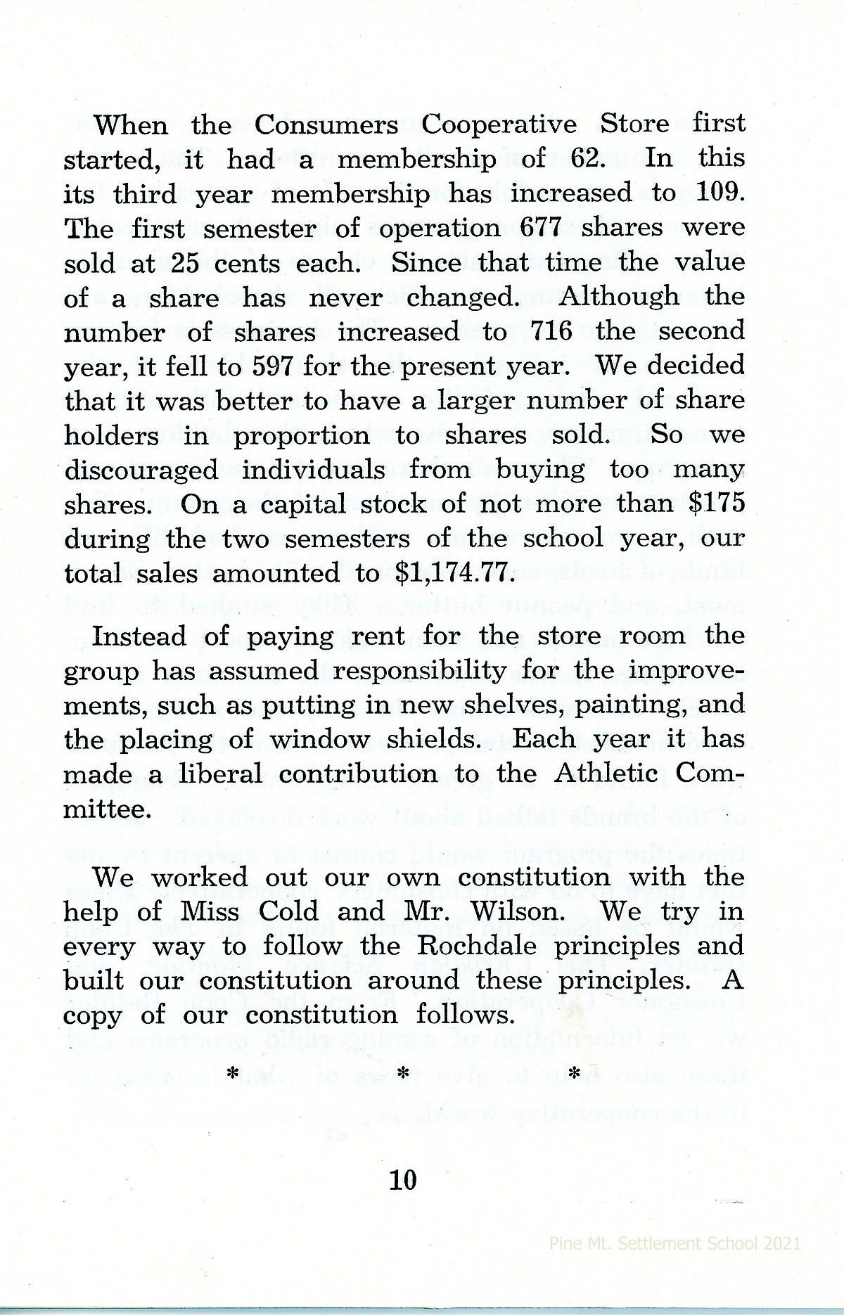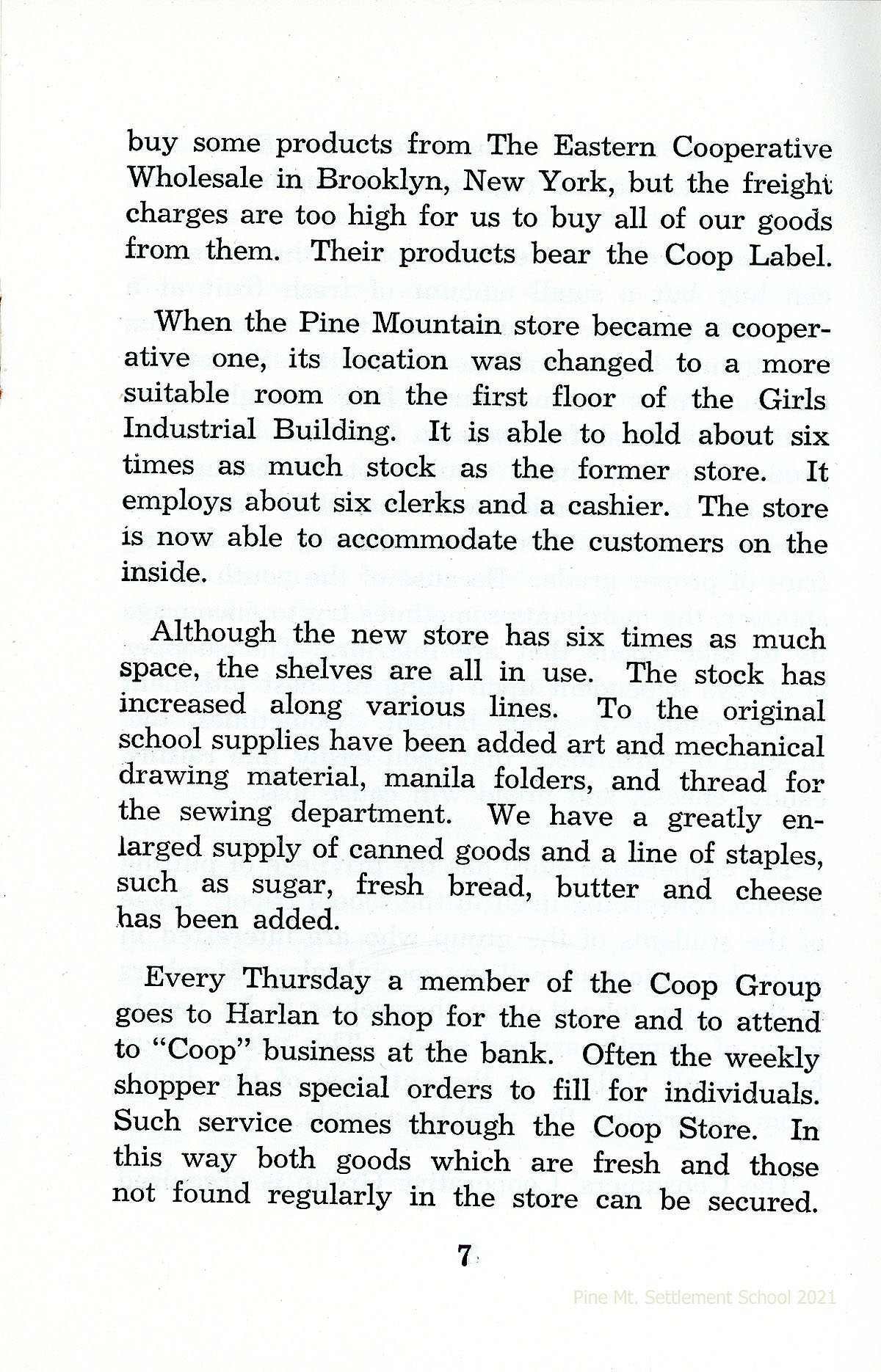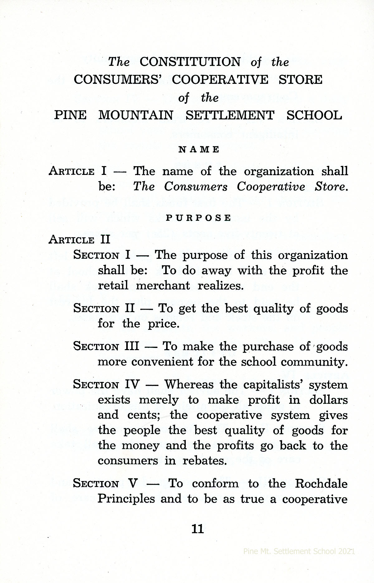 Schulman’s article describes the Co-op at Pine Mountain Settlement School in operation since 1937, as an exemplary model. He describes the mountain co-op store on campus as largely centered on an inventory of groceries and school supplies and modeled on the Rochdale principles as a base for the sophomore curriculum at the School. He outlines the Rochdale principles: