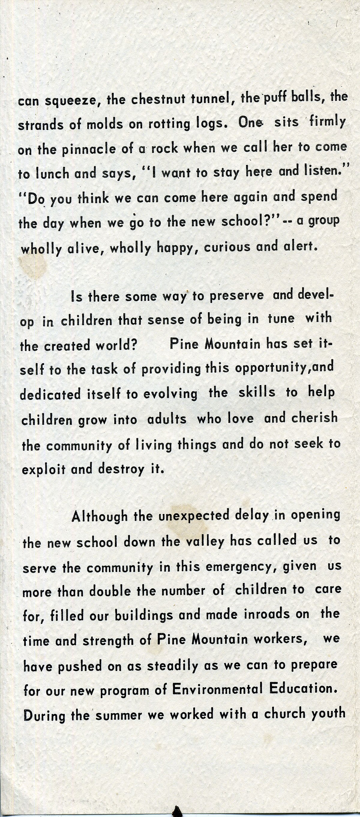 Is there some way to preserve and develop in children that sense of being in tune with the created world? Pine Mountain has set itself to the task of providing this opportunity, and dedicated itself to evolving the skills to help children grow into adults who love and cherish the community of living things and do not seek to exploit and destroy it.