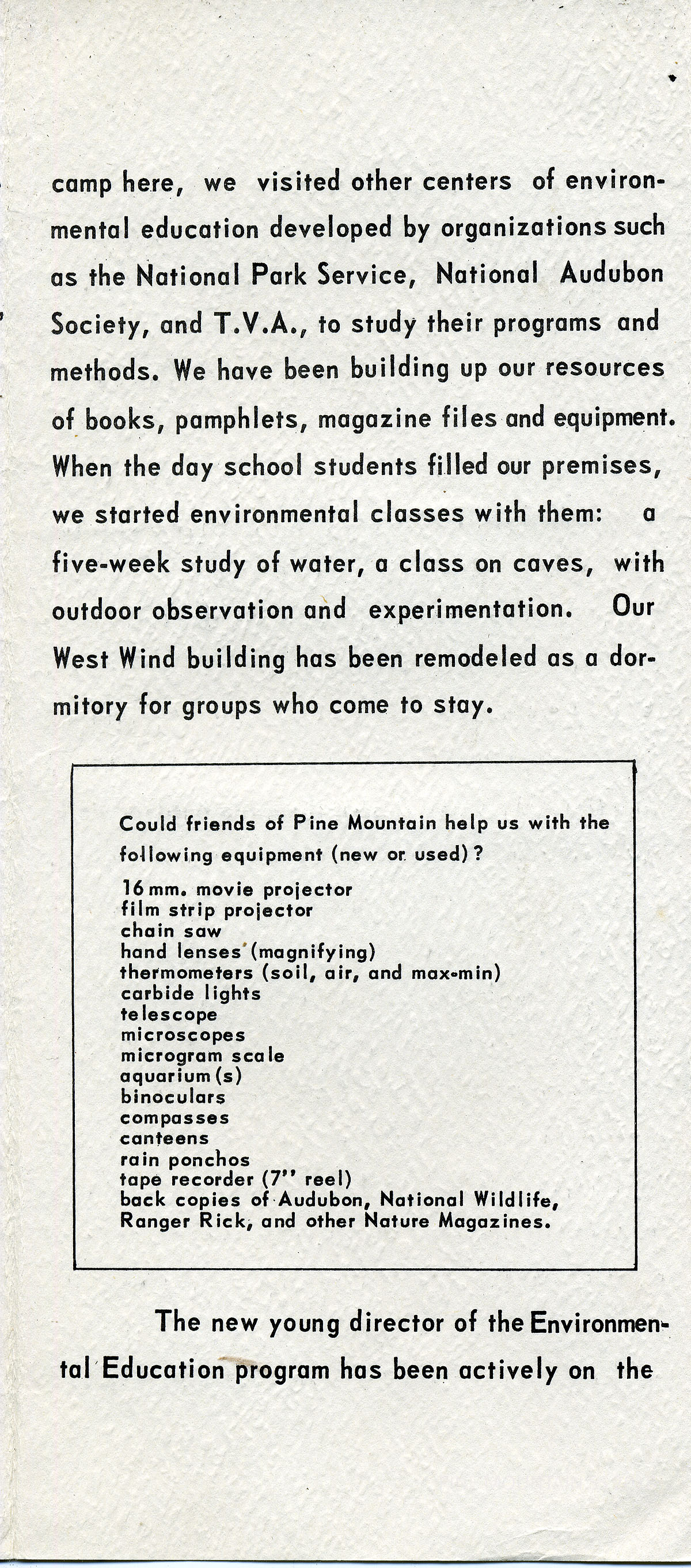 …camp here, we visited other centers of environmental education developed by organizations such as the National Park Service, National Audubon Society, and T.V.A., to study their programs and methods. We have been building up our resources of books, pamphlets, magazine files and equipment. When the day school students filled our premises, we started environmental classes with them: a five-week study of water, a class on caves, with outdoor observation and experimentation. Our West Wind building has been remodeled as a dormitory for groups who come to stay.