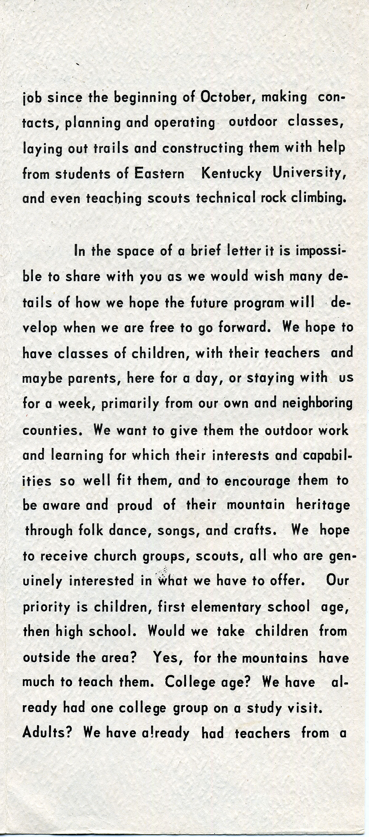 In the space of a brief letter it is impossible to share with you as we would wish many details of how we hope the future program will develop when we are free to go forward. We hope to have classes of children, with their teachers and maybe parents, here for a day, or staying with us for a week, primarily from our own and neighboring counties. We want to give them the outdoor work and learning for which their interests and capabilities so well fit them, and to encourage them to be aware and proud of their mountain heritage through folk dance, songs, and crafts. We hope to receive church groups, scouts, all who are genuinely interested in what we have to offer. Our priority is children, first elementary school age, then high school. Would we take children from outside the area? Yes, for the mountains have much to teach them. College age? We have already had one college group on a study visit. Adults? We have already had teachers from a…