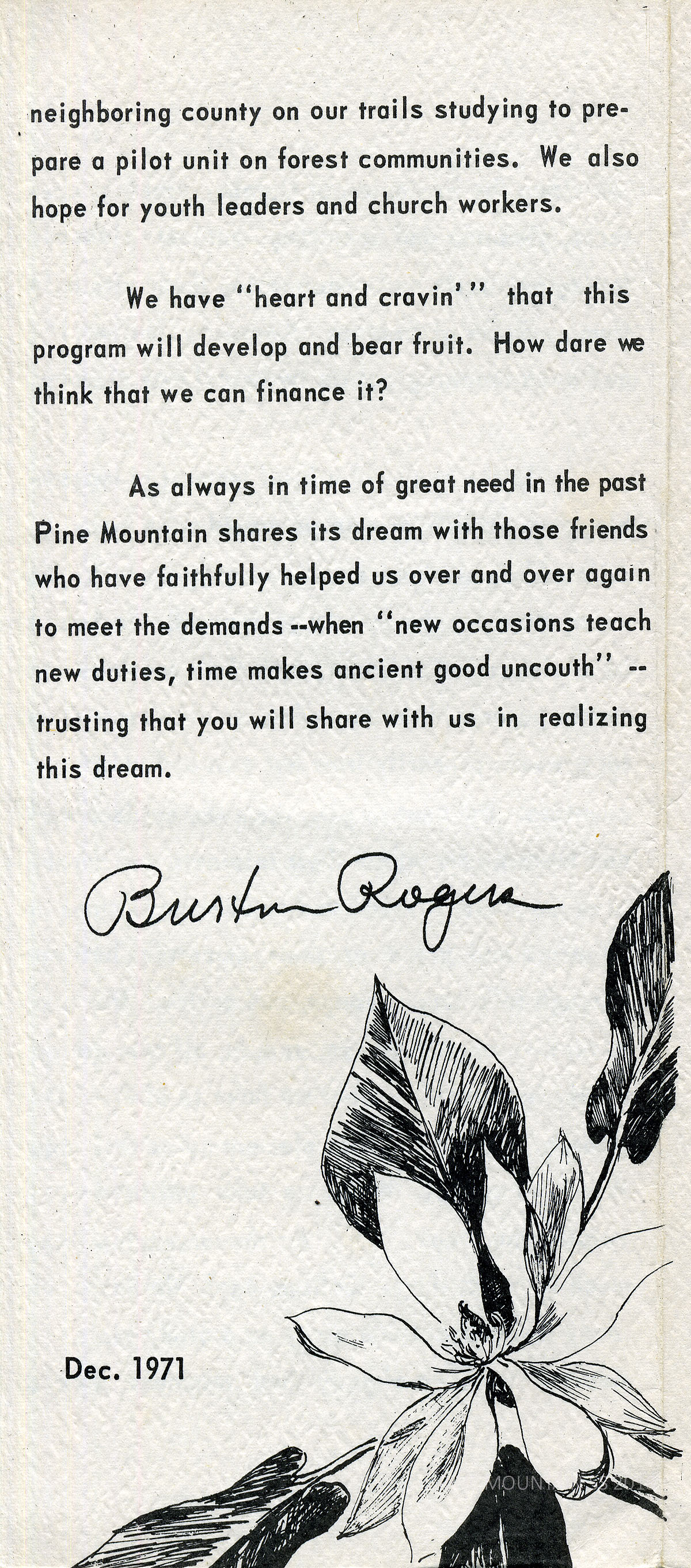 As always in time of great need in the past Pine Mountain shares its dream with those friends who have faithfully helped us over and over again to meet the demands — when “new occasions teach new duties, time makes ancient good uncouth” — trusting that you will share with us in realizing this dream.