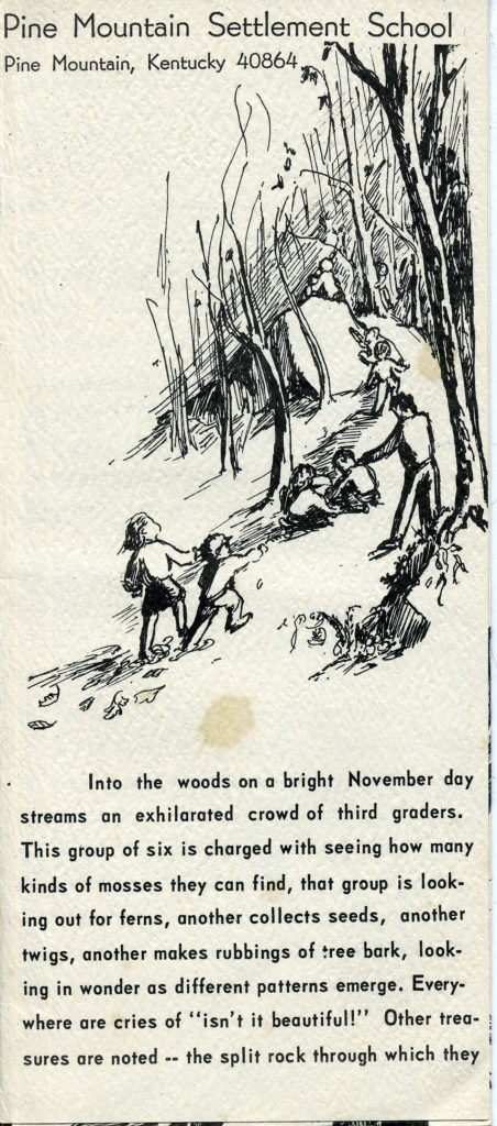 The following brochure was one of two designed to introduce schools to the Environmental Education program at PMSS. The illustrations on the front cover and the last page were done by Mary Rogers, a PMSS staff member from 1942 until 1993 and wife of PMSS Director Burton Rogers. These are some of many delightful drawings by Mary Rogers, each conveying the spirit of Pine Mountain Settlement School.