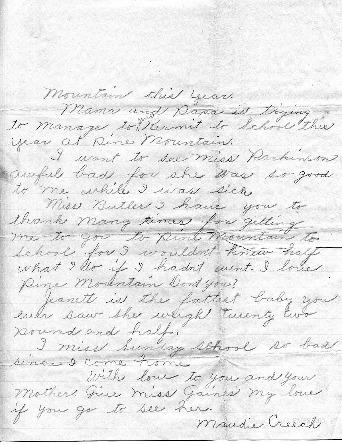 41. Maudie Creech to Miss [Marguerite] Butler, May 23, 1921. “…Miss Butler, I have you to thank many times for getting me to go to Pine Mountain to school for I wouldn’t know half what I do if I hadn’t went. I love Pine Mountain. Don’t you?…” Mentions Grant, Mr. [Luigi] Zande, MIss Parkinson, Baby Jeanett (sic) and Miss [Ruth B.] Gaines.