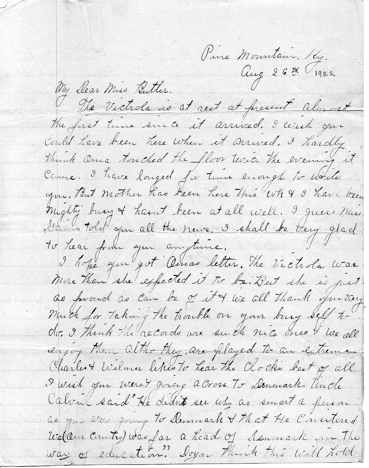 42. Delia [Creech] to Miss Butler, Aug. 26, 1922. “The Victrola is at rest at present almost the first time since it arrived. I wish you could have been here when it arrived. I hardly think Oma [Creech] touched the floor twice the evening it came.” Also mentions Miss Gaines, Charles & Wilmer, Uncle Calvin, Miss Metcalf, Henry, Miss [Ethel] de Long, Mrs. [Ethel de Long] Zande, Hulda, Ethel, Nora, Aunt Sarah, and Miss Robbins.