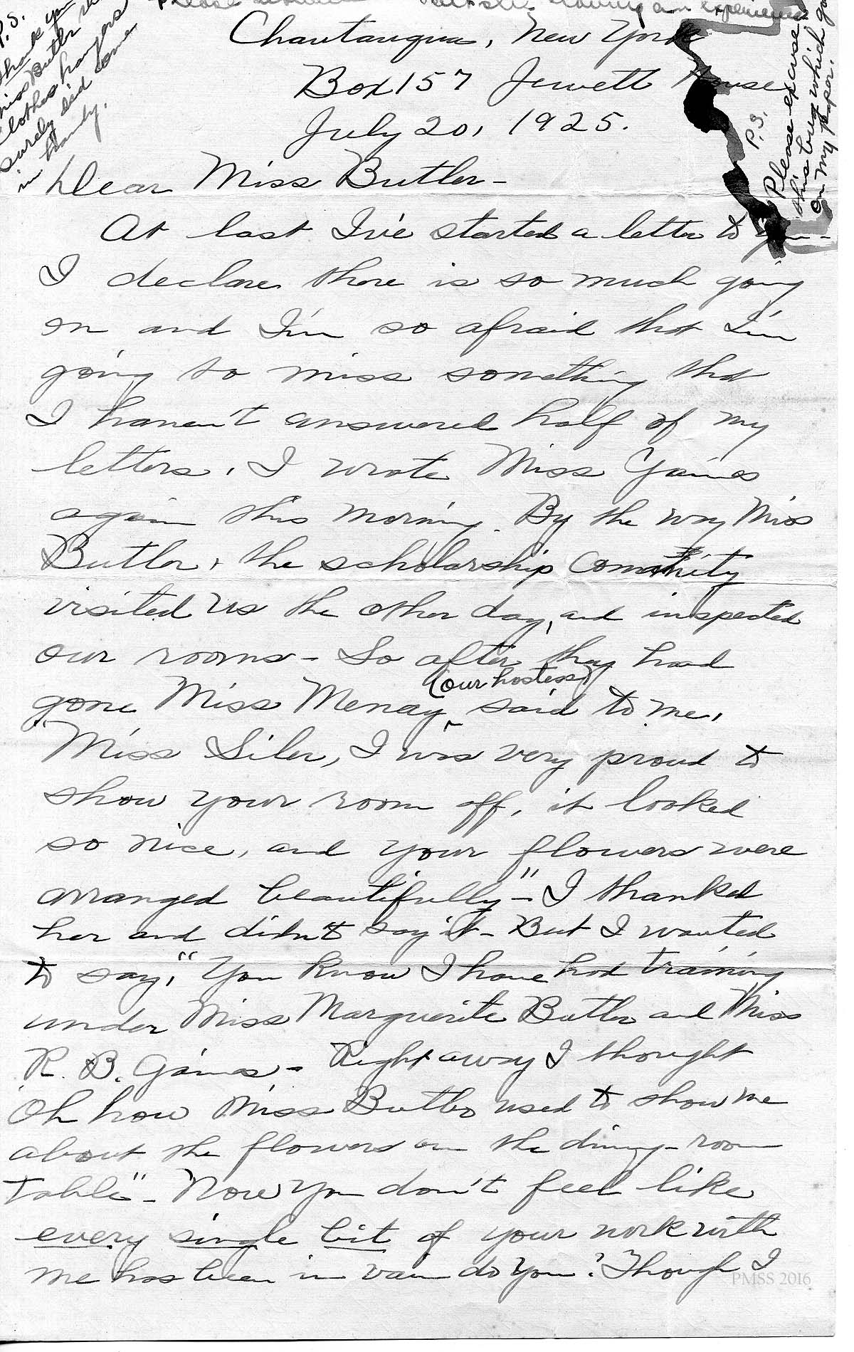 43. Clara to Miss Butler, July 20, 1925, Chautaugua, New York. “Oh, Mr. [John] Philip Sousa and his band has just been here…. They are just back from a tour of Europe…. I have never in my life heard anything better.” Mentions Miss Gaines, Miss Menay, Miss Siler, Mr. [Darwin D.] Martin in Buffalo, Miss Jeannette and Miss McCullough.