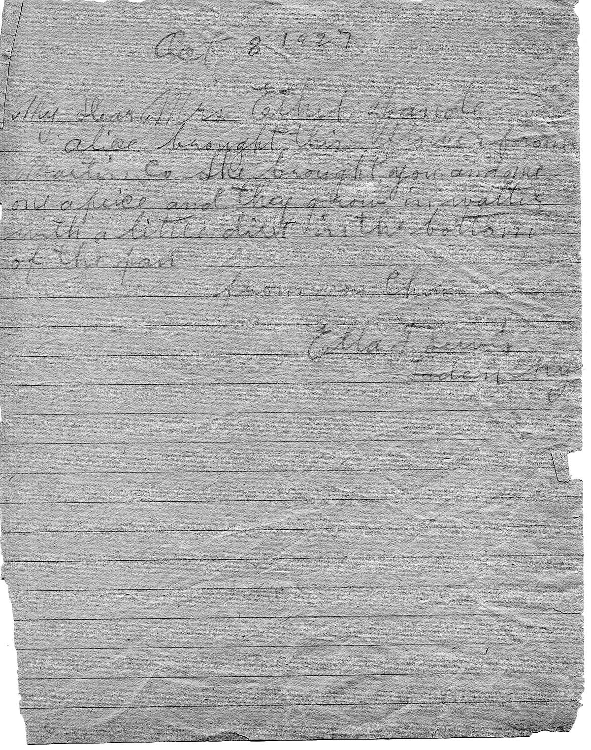 45. Ella J. Lewis to Mrs. Ethel Zande, Oct. 8. 1927, Laden, Ky. “Alice brought this flower from Martin Co. She brought you and me one apiece and they grow in water with a little dirt in the bottom of the pan.”